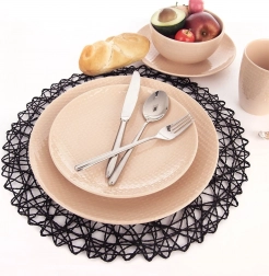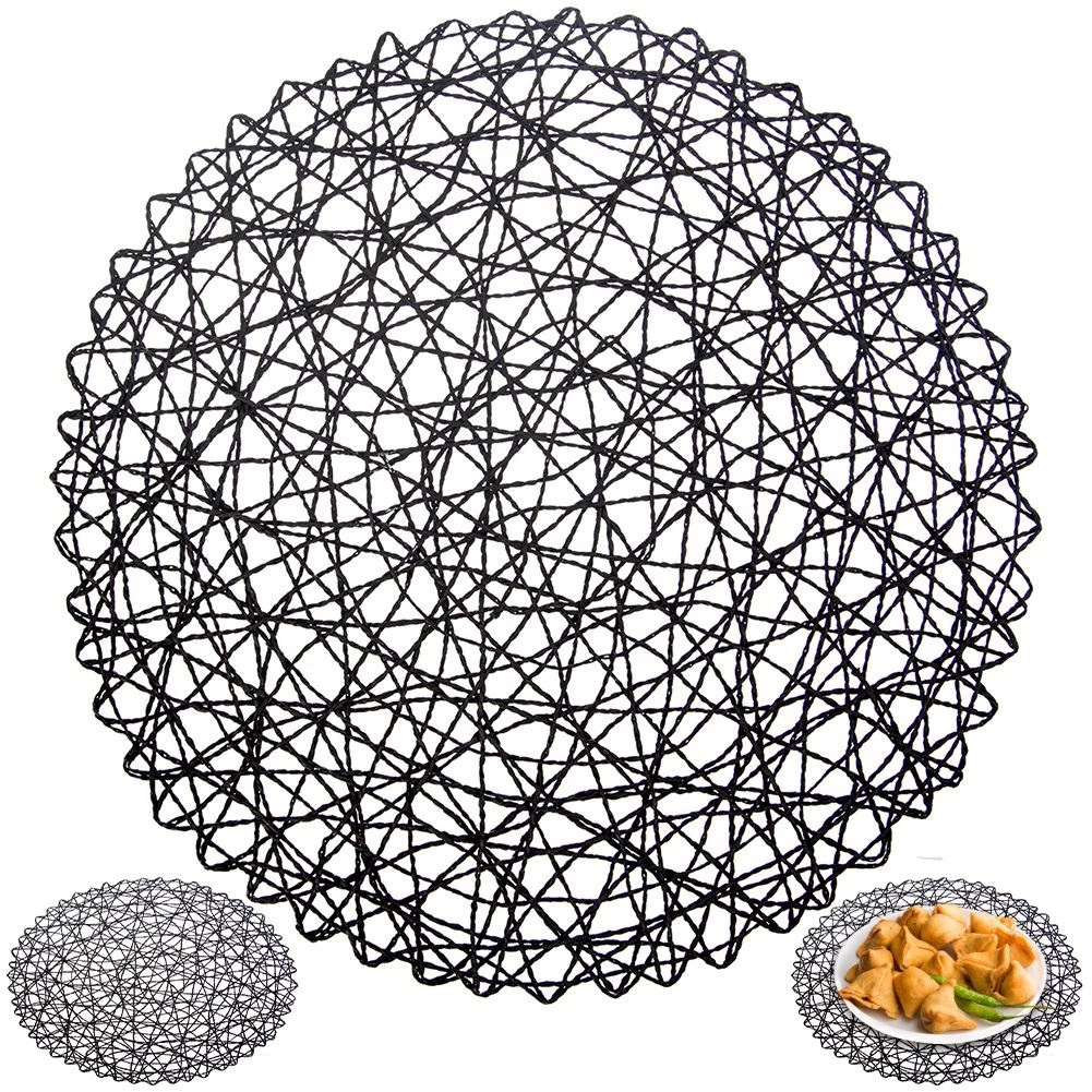 Elegantna namizna dekoracija v obliki okroglega papirnatega podstavka v črni barvi pogrnjeni mizi doda moderen in uglajen videz. Struktura, ki spominja na čipko, deluje zelo dekorativno in izstopa pod krožniki ter steklenimi ali keramičnimi dodatki.