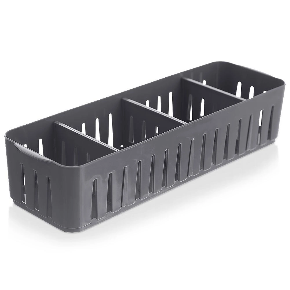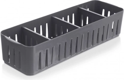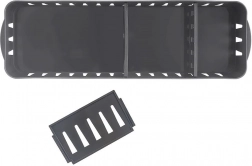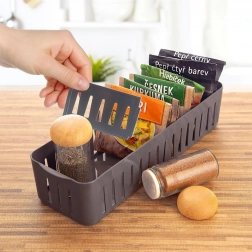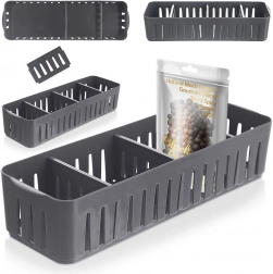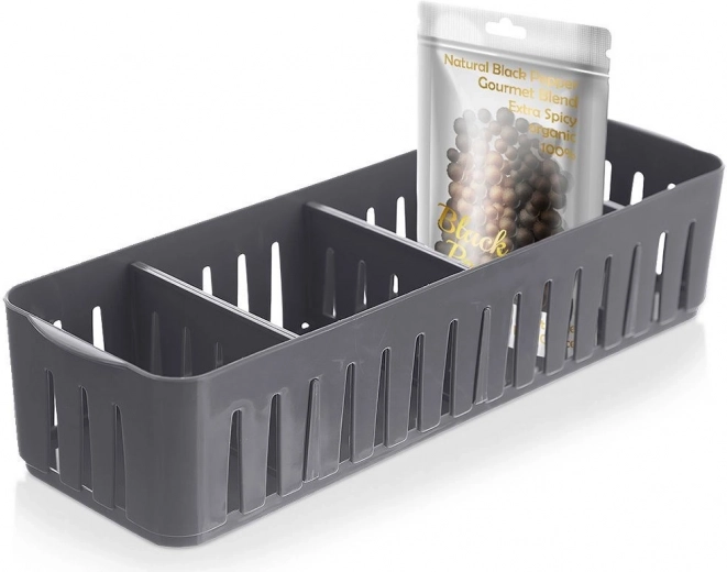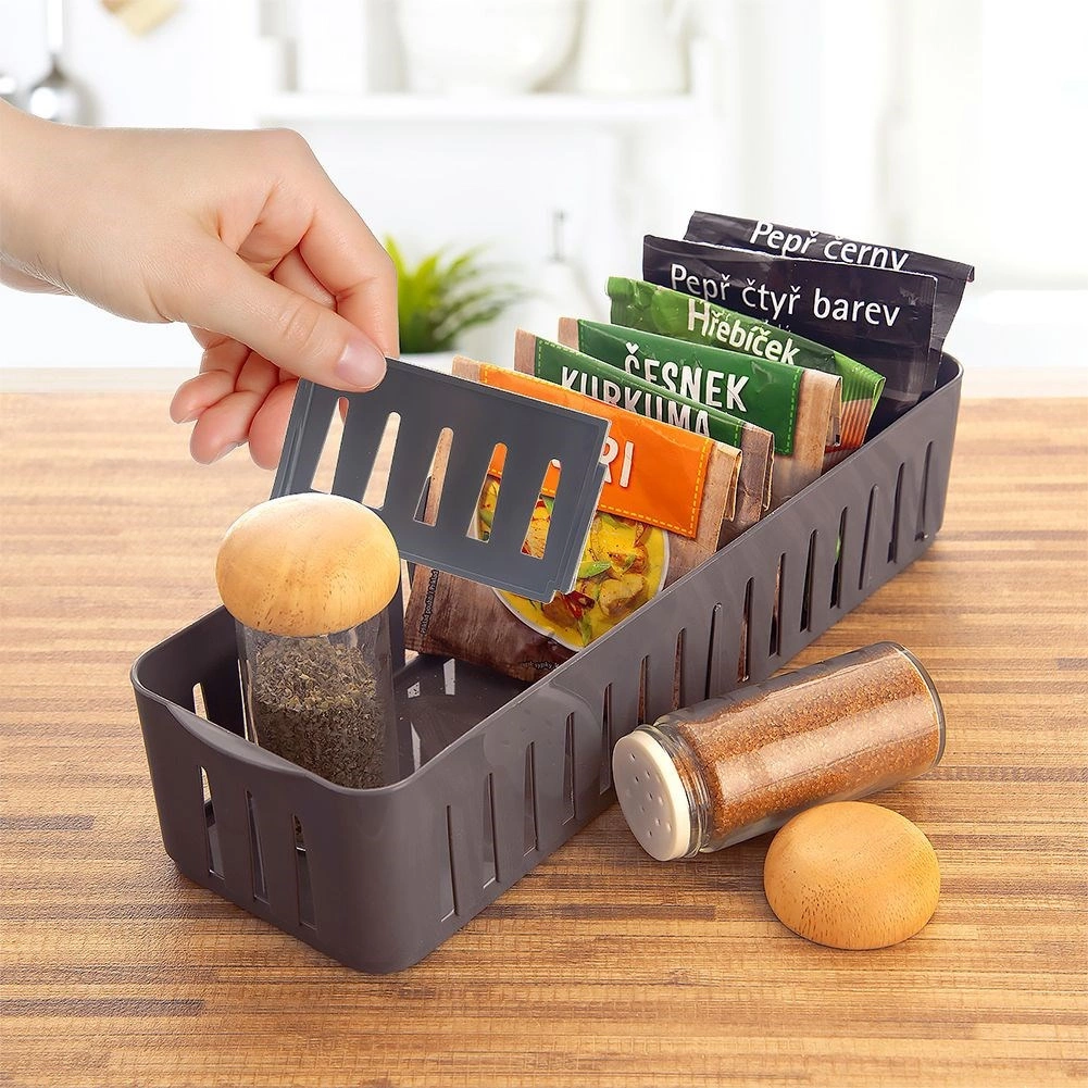 Poskrbite za red med vrečkami z začimbami in zelišči. Ta siv organizator s kompaktno velikostjo ponuja premišljeno razdelitev prostora in tudi odprte vrečke varno drži v navpičnem položaju – brez razsutja in nereda v predalu. Z odstranljivimi pregradami lahko notranjo razporeditev preprosto prilagodite.