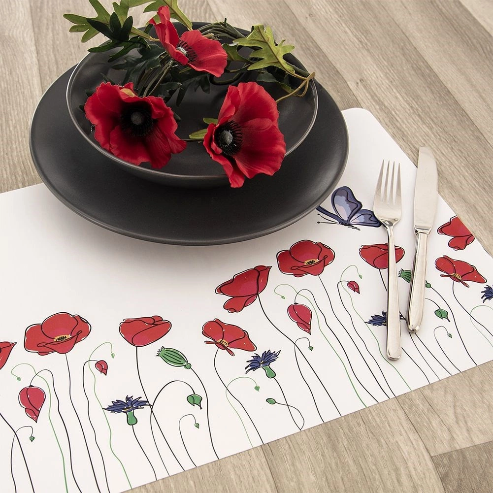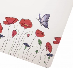 Praktičen in dekorativen podstavek v beli barvi z izrazitim motivom rdečih makov ter nežnim detajlom metulja lepo dopolni vašo jedilno posodo. Zaradi pravokotne oblike se popolno prilega pod krožnik in poskrbi za harmoničen videz mize.