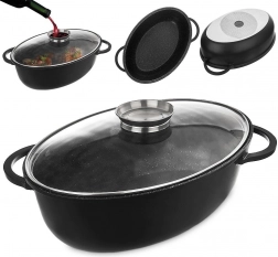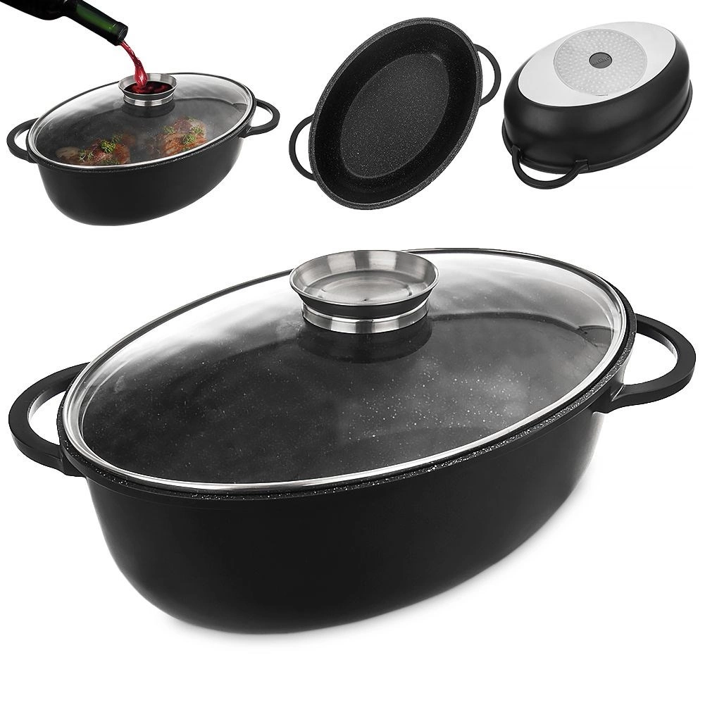 Ta ovalen pekač je idealen za peko, dušenje in gratiniranje večjih kosov mesa, zelenjave in družinskih jedi. Zahvaljujoč neoprijemljivi granitni plasti PFLUON GRANIT boste jedi pripravili z manj olja, čiščenje pa bo hitro in enostavno. Stekleni pokrov omogoča nadzor nad potekom kuhanja, vgrajeni dozirnik v pokrovu pa olajša zalivanje z vodo, vinom ali omako brez potrebe po dvigovanju pokrova.