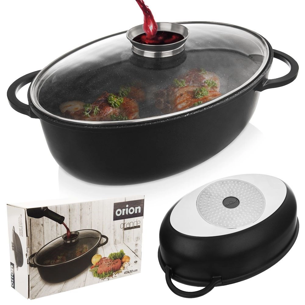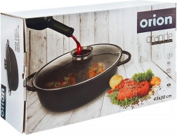 V pakiranju prejmete 1× globok ovalen pekač (zunanje mere 45 × 27,5 × 13 cm, notranje 37,5 × 25 × 13 cm, prostornina 8 l) in 1× stekleni pokrov (zunanje mere 39 × 26,5 × 7 cm). ORION – originalen izdelek češke znamke, izdelan v skladu z evropskimi standardi.