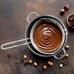 Dva stranska izlivalnika olajšata čisto prelivanje stopljenih sestavin. Odporno nerjavno jeklo je enostavno za čiščenje, primerno za pomivalni stroj in zdravju neškodljivo. Zaradi premišljene oblike zlahka obrišete tudi ostanke čokolade.