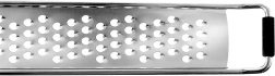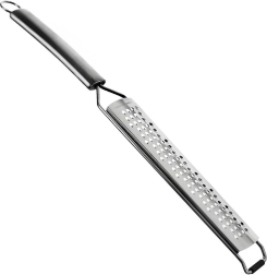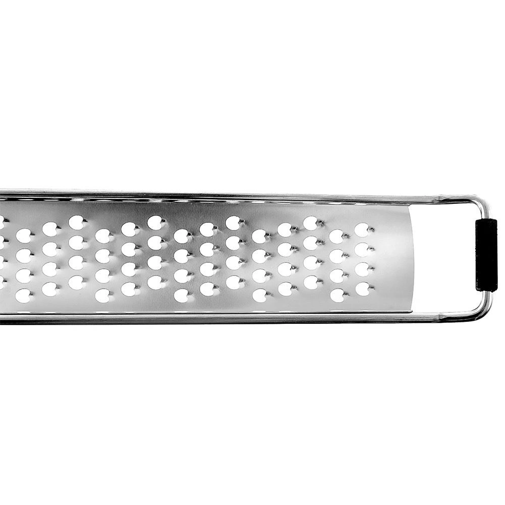 Praktičen ploski ribežen iz nerjavnega jekla dolžine 38 cm in širine 4 cm za hitro in enakomerno ribanje. Zahvaljujoč ostrim odprtinam zlahka naribate zelenjavo, trde sire, česen, oreščke in citruse. Ima dolg ročaj z ušescom za obešanje, nedrseč zaključek za varno uporabo na posodi ter zaščitni etui za varno shranjevanje. Primerno za pomivalni stroj.
