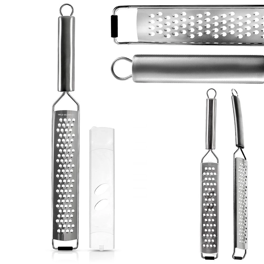 Ostre perforacije zagotavljajo fina in enakomerna rezultata pri ribanju zelenjave, trdega sira, čokolade ali začimb, kot so ingver, cimet ali muškatni orešček. Praktičen zaščitni etui ščiti rezilo in ostali pribor v predalu ter olajša shranjevanje.