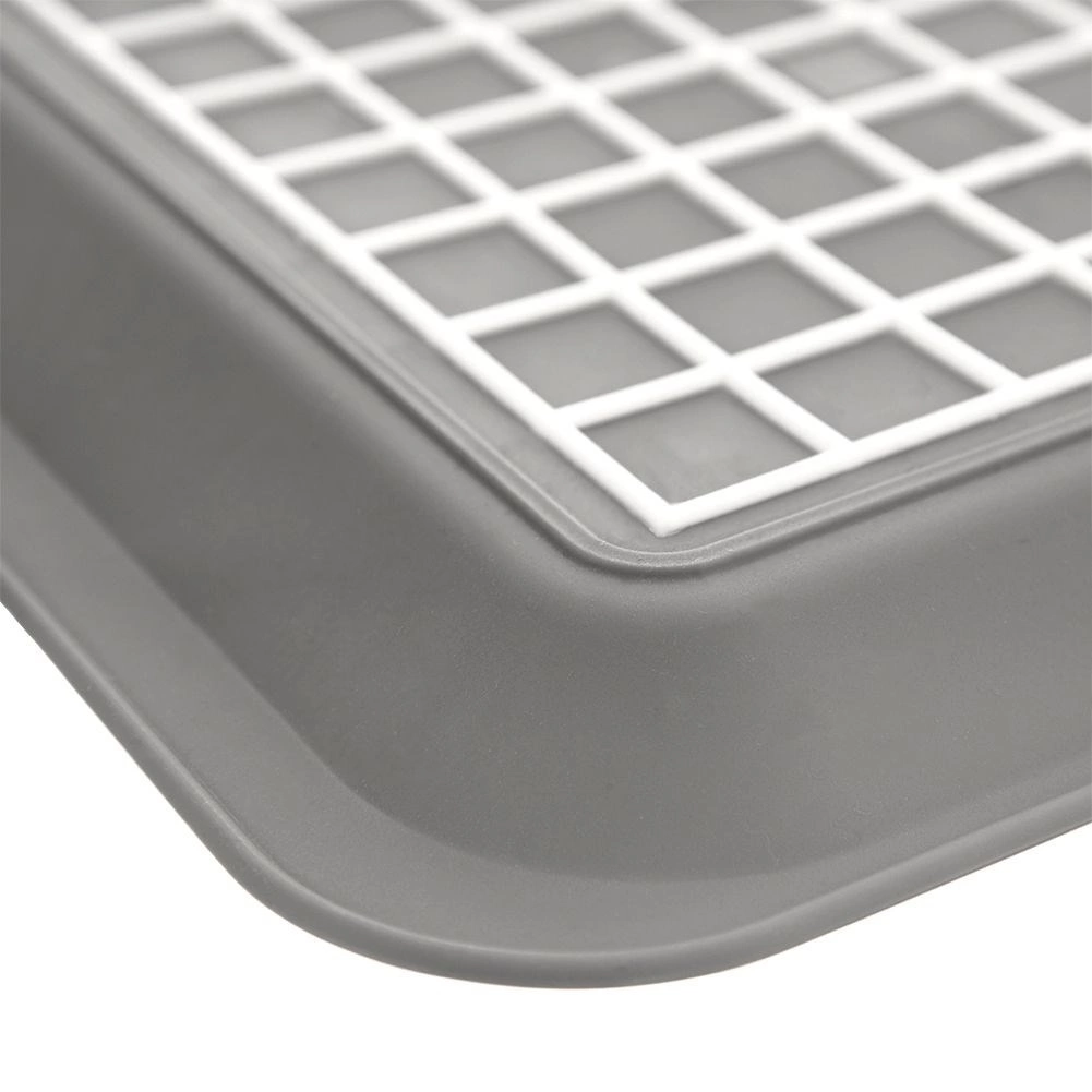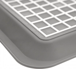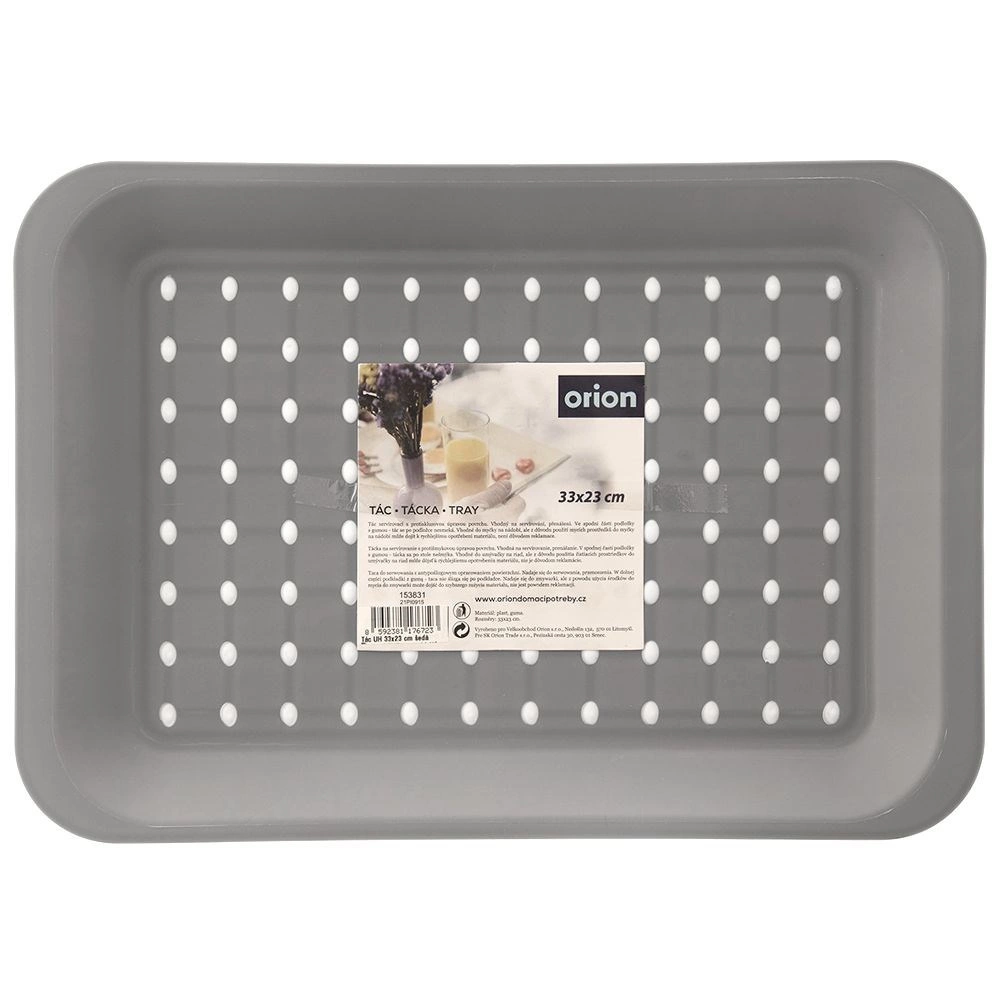 Siv servirni pladenj je zanesljiv pomočnik za postrežbo pijač in jedi. Odporna plastika z belimi detajli in protizdrsno obdelavo zagotavlja stabilnost pri prenašanju, tako na zgornji površini kot na spodnji strani. Pladenj se zaradi povišanega roba udobno drži in zmanjšuje tveganje razlitja.