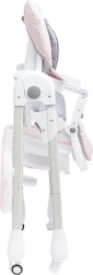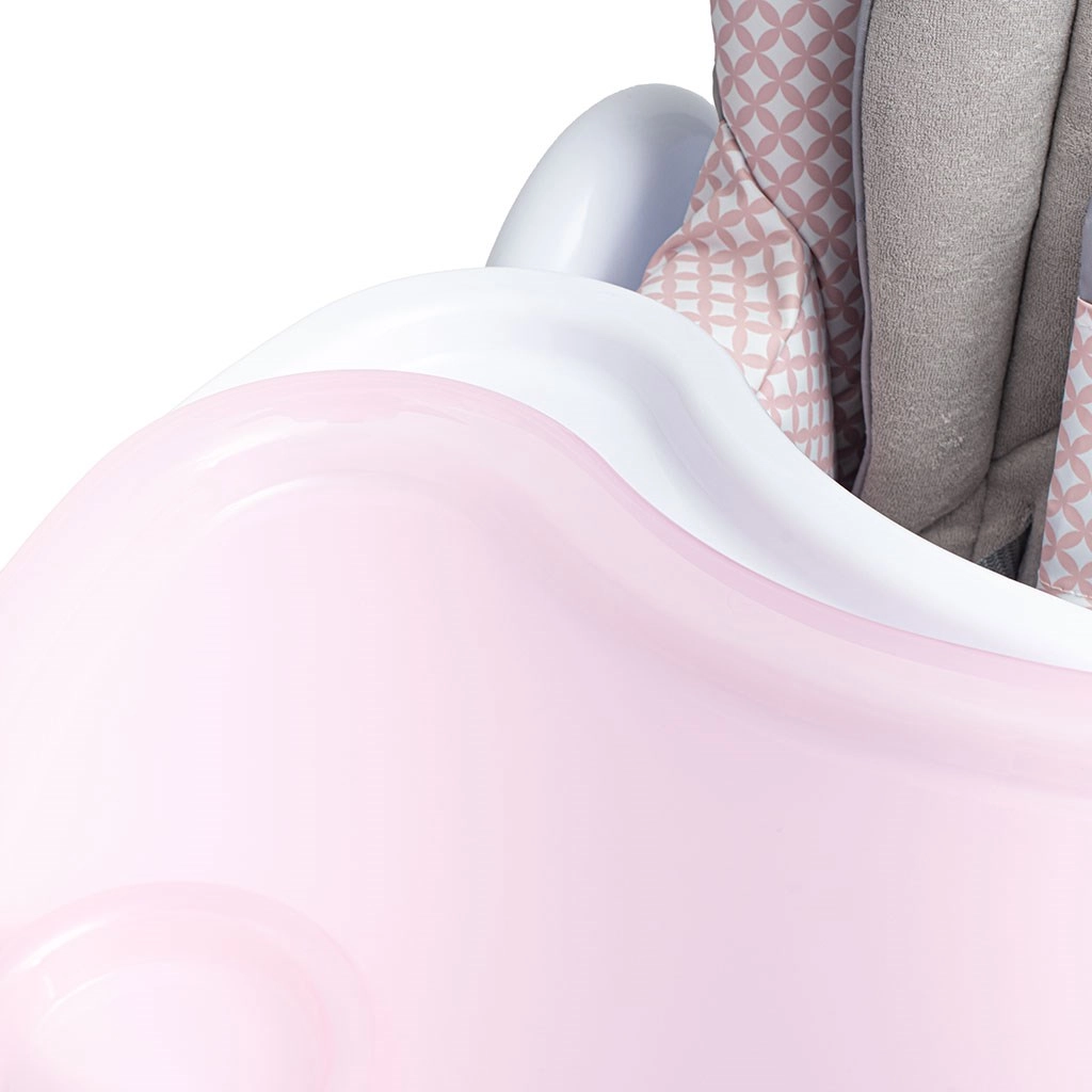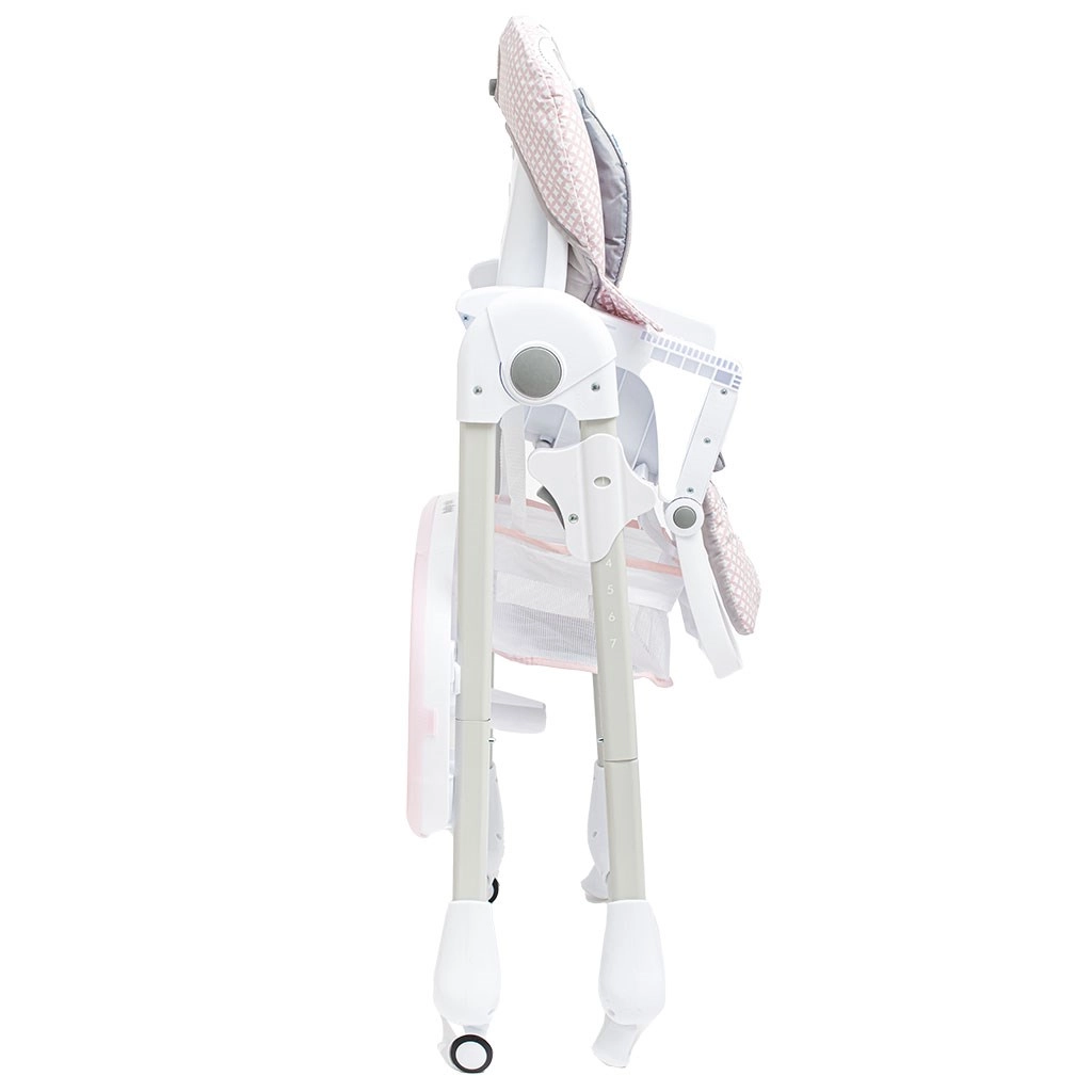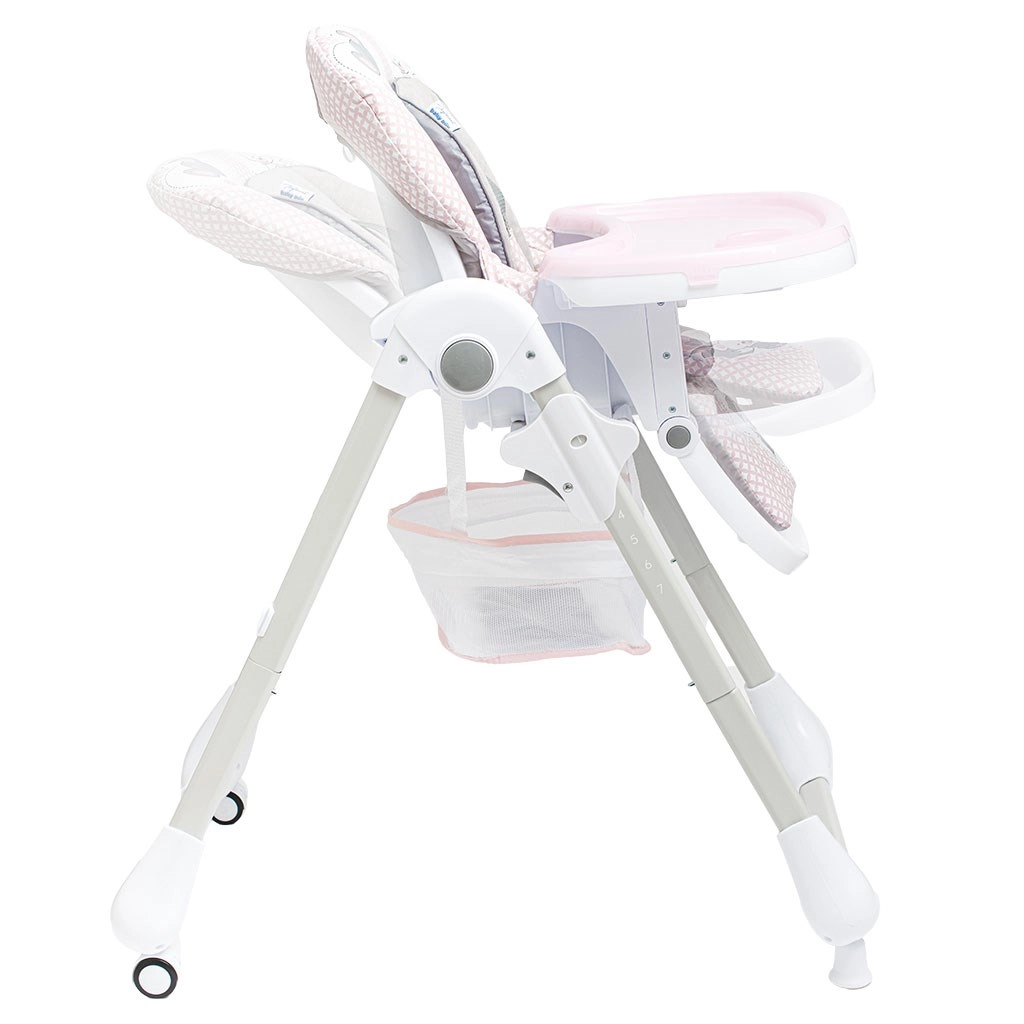Stolček za hranjenje BABY MIX Infant roza združuje udobje, varnost in enostavno vzdrževanje v enem. S 7-stopenjsko nastavitvijo višine ga zlahka prilagodite višini mize in rasti otroka. Trije položaji naslonjala in dvo-položajna opora za noge zagotavljajo pravilno ergonomijo pri hranjenju in počitku. Praktičen dvojni, odstranljiv pladenj nudi prostor za hrano in igro, medtem ko spodnja košarica ohranja vse potrebščine pri roki.