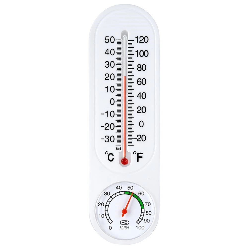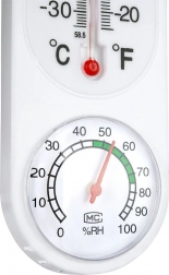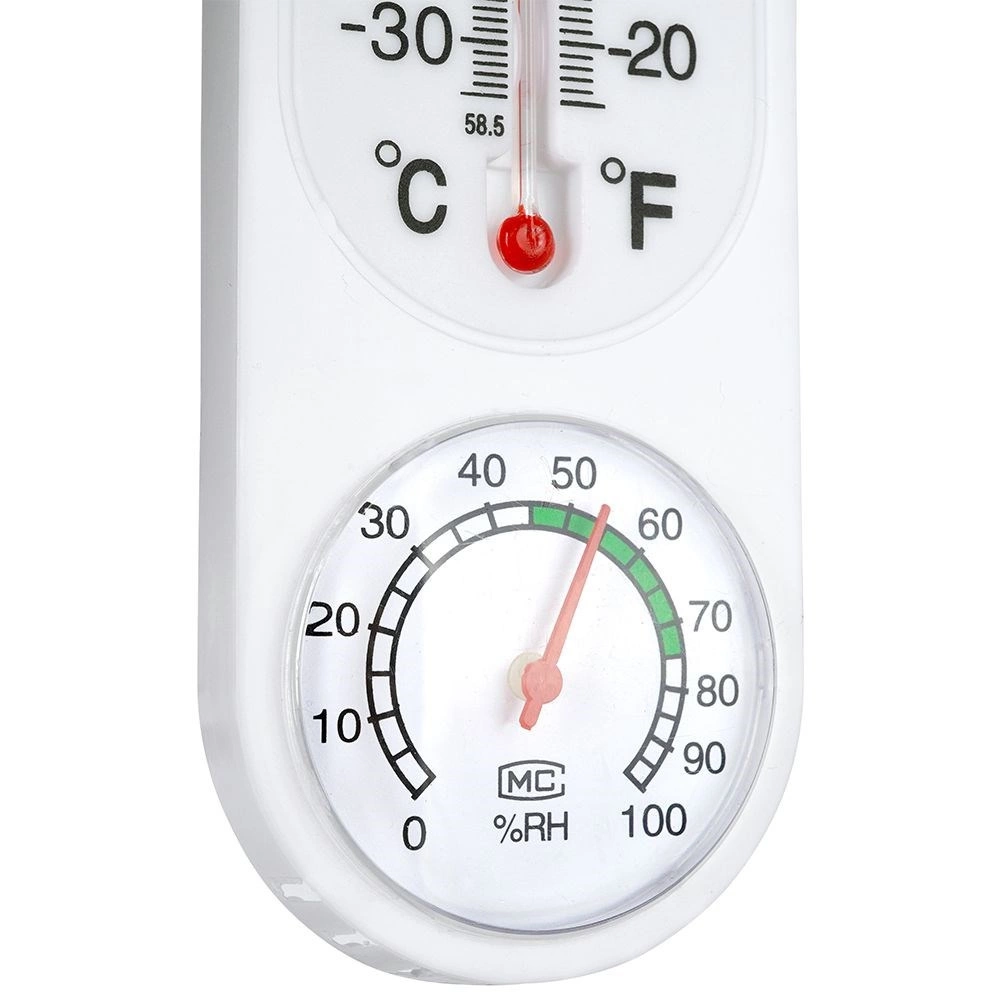 Ta kombinirani termometer in vlagomer vam omogoča pregled nad okoljsko temperaturo in relativno vlago v realnem času. Vertikalni kapilarni stolpec prikazuje temperaturo v °C in °F, spodnji krožni kazalnik pa vlago v razponu 0–100 % RH s komfortno cono za hitro orientacijo.