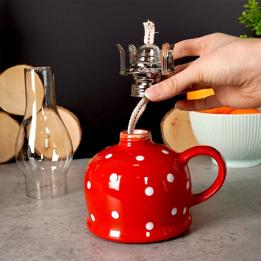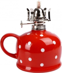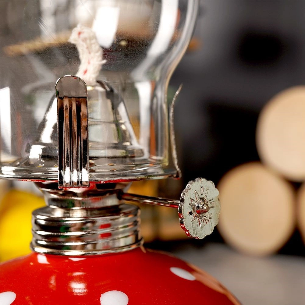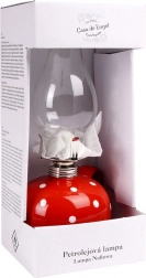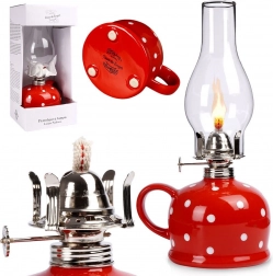 Tradicionalna petrolejska/naftna svetilka v elegantnem retro slogu združuje dekorativen videz in zanesljivo svetlobo brez elektrike. Steklena dimnica učinkovito ščiti plamen in prepušča dovolj svetlobe, keramična posoda v rdeči barvi z belimi pikami je izrazit oblikovalski element.