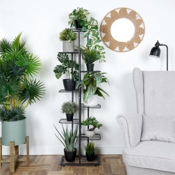 Odporna kovinska konstrukcija v mat črni barvi se ponaša z enostavnim vzdrževanjem in dolgo življenjsko dobo. Stojalo ponuja premišljene dimenzije polic za različne vrste lončnic – od listnatih rastlin, sukulentov, kaktusov do vzpenjavk. Odlično je tudi za dekoracije, okvirje in drobne dodatke.