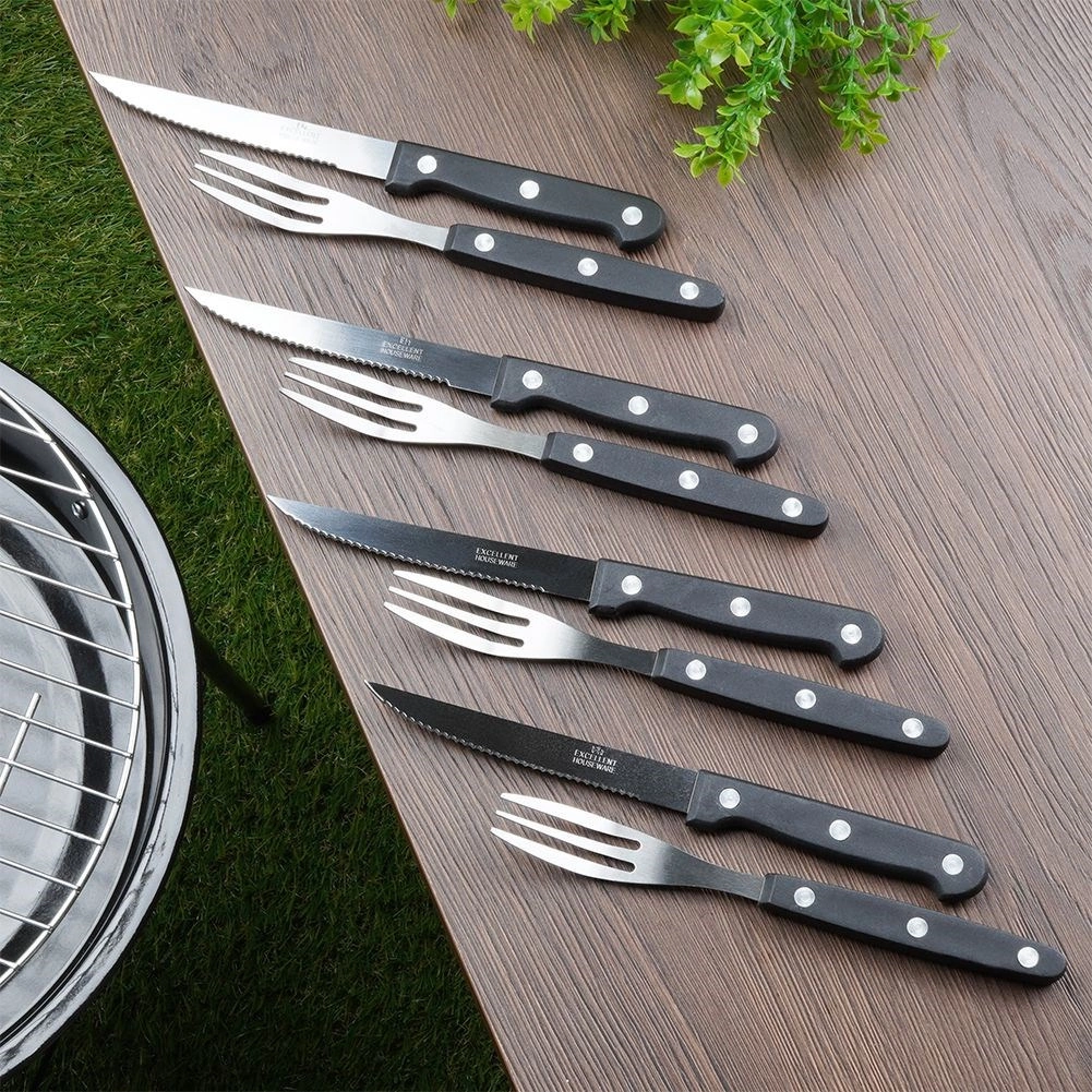 Uživajte v gladkem rezanju mesa brez trganja. Nazobčani noži z rezilom 11,5 cm iz nerjavnega jekla režejo zanesljivo in čisto, vilice pa zagotovijo stabilen oprijem. Ergonomski ročaji iz črne, odporne plastike s 3-točkovnim zakovičenjem izvrstno ležijo v roki in omogočajo odličen nadzor pri rezanju.