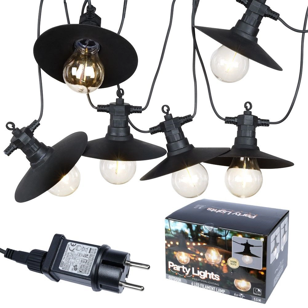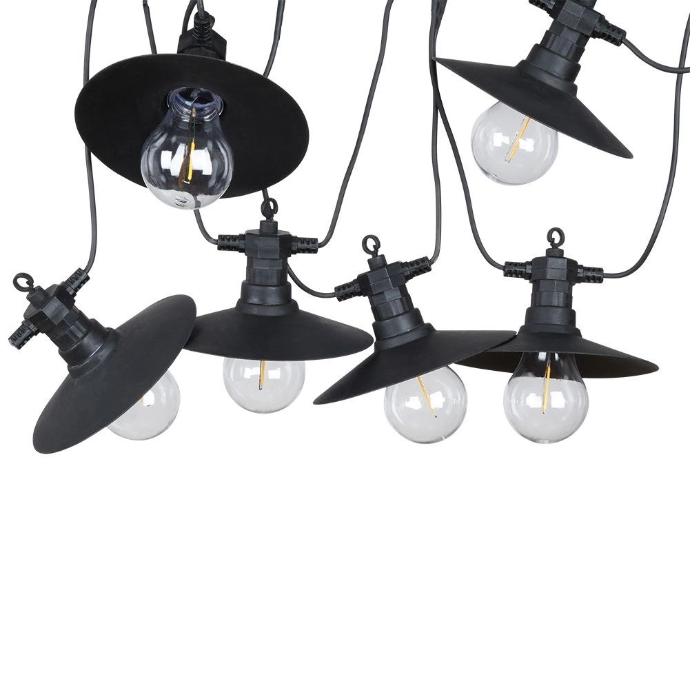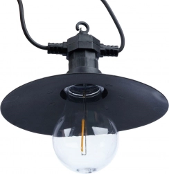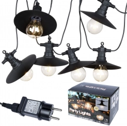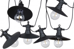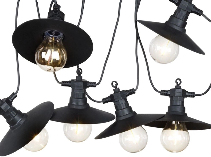 Ta odporna zunanja veriga združuje elegantna črna kovinska senčila (Ø 15 cm) z prozornimi LED žarnicami (Ø 6 cm, dolžina 7 cm), ki usmerjajo svetlobo navzdol in ustvarjajo prijetno toplo osvetlitev. Zaradi razmika 50 cm med žarnicami enakomerno osvetli sedežni prostor, paviljon ali vrtno zabavo.