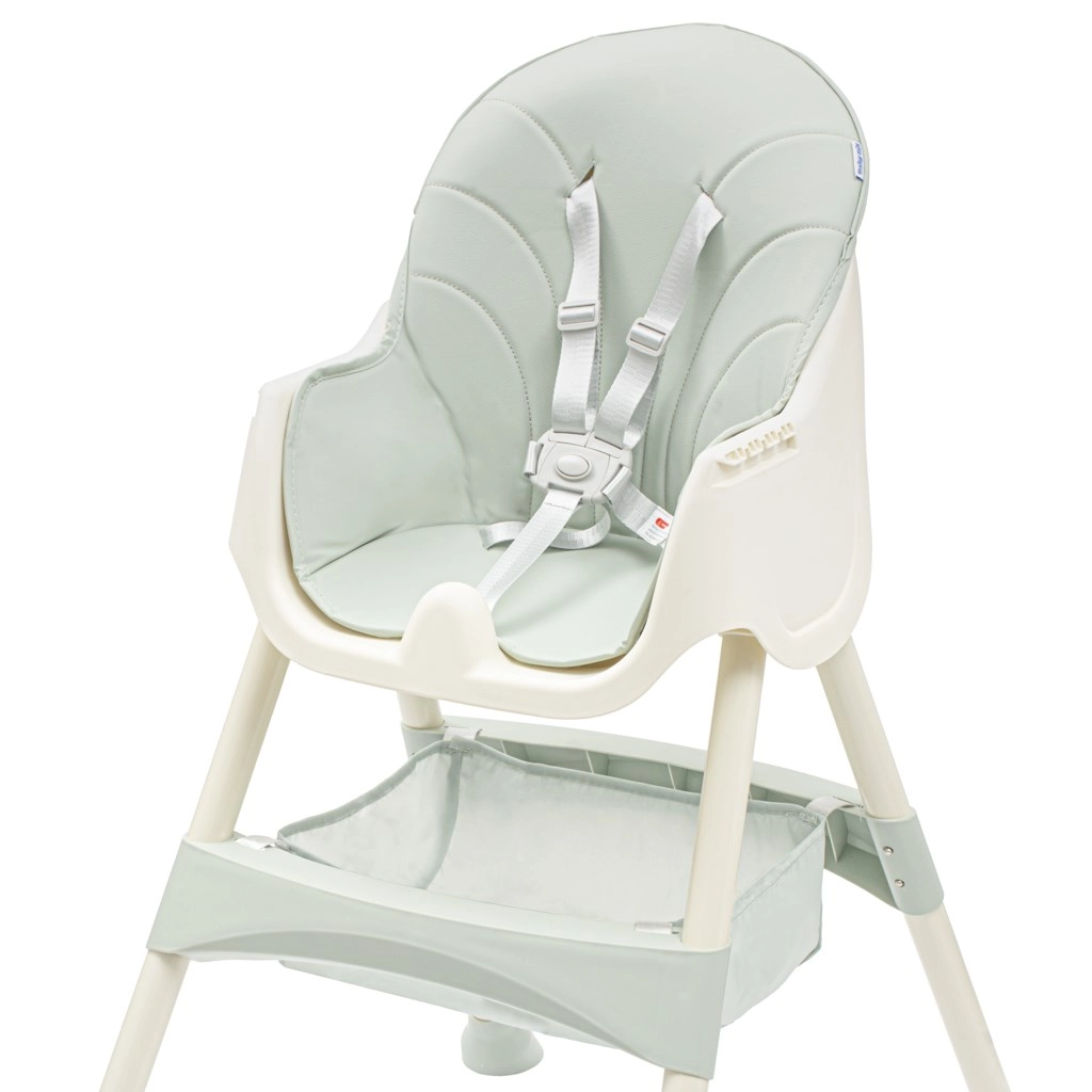 Stabilna konstrukcija z nedrsečimi zaključki nog preprečuje neželeno premikanje, opiralnik za noge pa povečuje udobje pri sedenju. Praktična tekstilna košara pod sedežem shrani vse potrebno – od robčkov do malih igrač. Z enostavno demontažo spodnjega dela nog stolček hitro spremenite v nizek stol za igro ali samostojno sedenje.