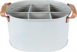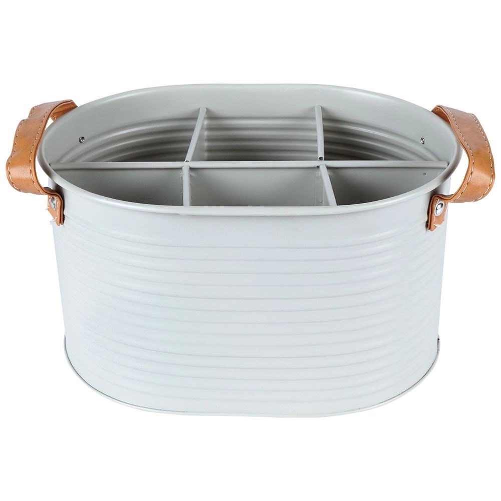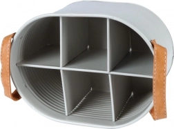Eleganten in trpežen organizator za prenašanje pijač, ki združuje funkcionalnost in slogovno zasnovo. Svetlo siva kovina z rebrasto površino je odporna na vsakodnevno uporabo, medtem ko rjavi usnjeni ročaji zagotavljajo udoben oprijem in enostaven transport.