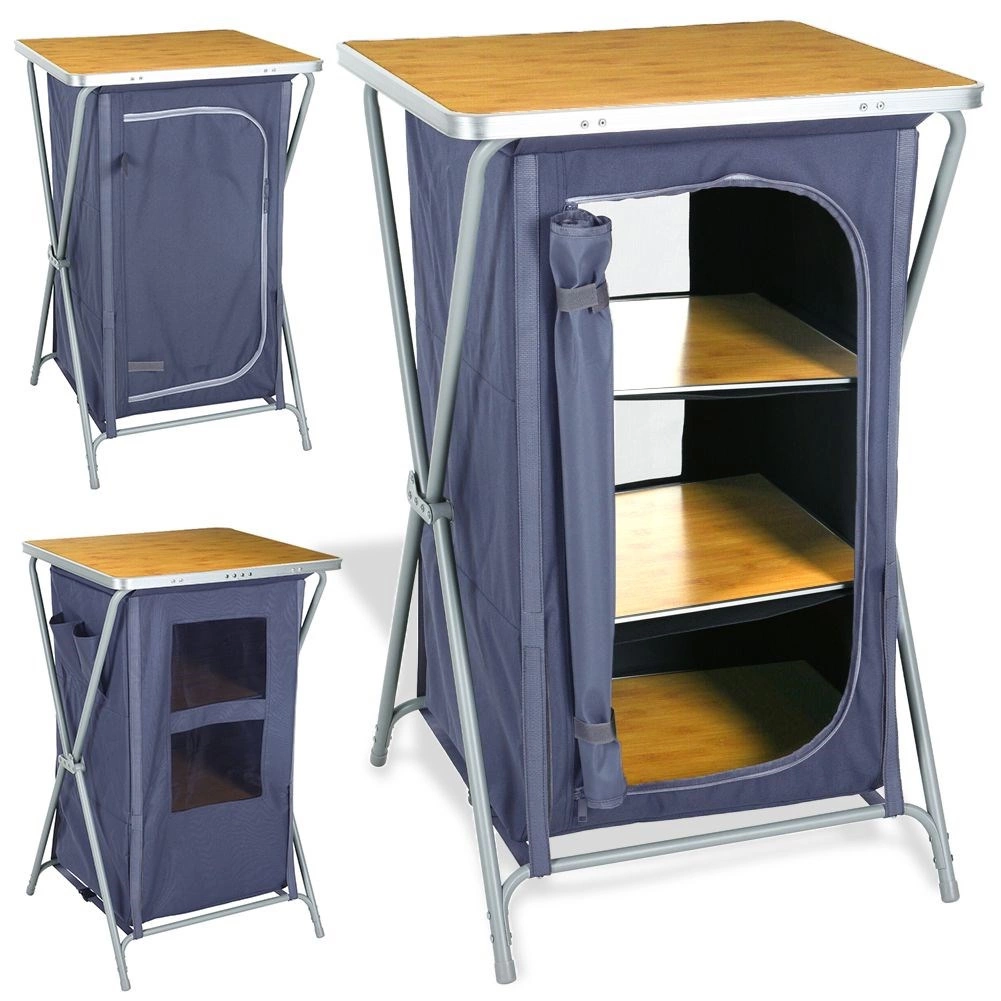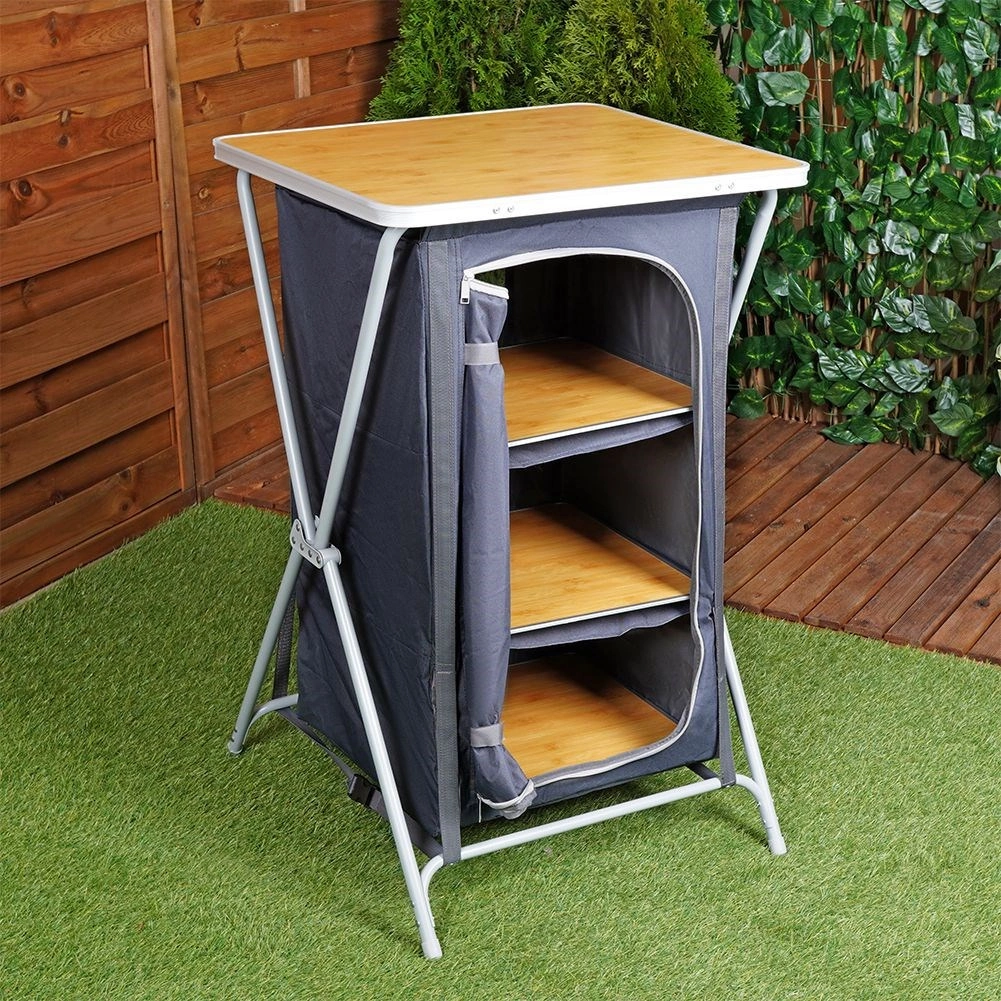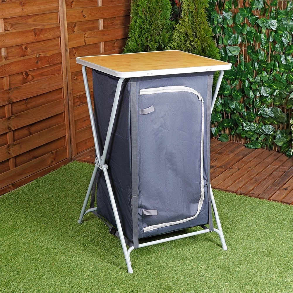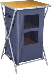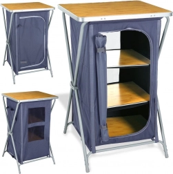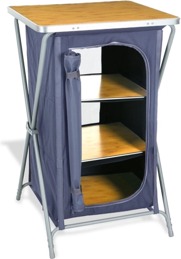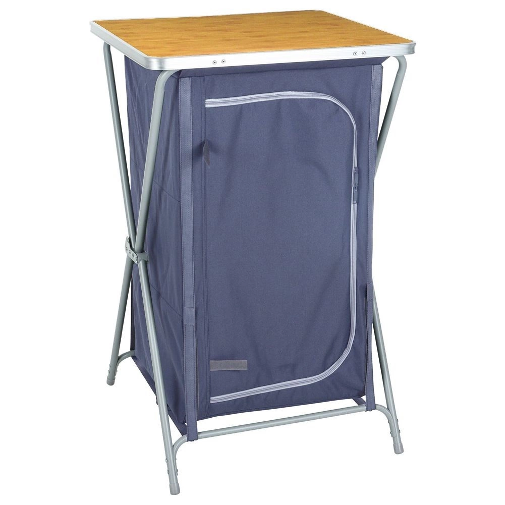 S to zložljivo kamp omarico dobite pregledno in higiensko shranjevanje opreme na poti. Odporno jekleno ogrodje, kakovosten poliester v temno sivi barvi in zgornja MDF plošča v videzu lesa tvorijo trdno, a mobilno kombinacijo, ki jo zlahka zložite in postavite.