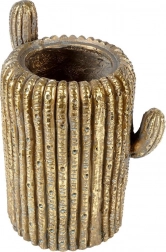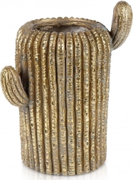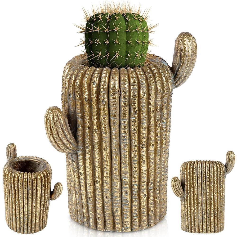 Stilski okrasni lonček/ovoj v obliki kaktusa z zlatim zaključkom poudari vaše rastline in doda notranjim ter zunanjim prostorom moderen pridih. Mere so 28,5 × 20,5 × 34,5 cm, izdelan je iz odpornega materiala in je odlična izbira za mizo, komodo ali polico. Zahvaljujoč realistični teksturi in izvirnemu dizajnu deluje dekorativno, je praktičen za gojenje ali kot ovoj za lonček, zlata barva pa lepo kontrastira z zelenjem rastlin.