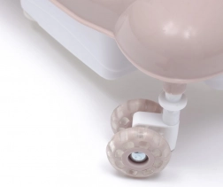Zahvaljujoč tristopenjski nastavitvi višine prilagodite hojnik trenutnim potrebam otroka. Sprednja silikonska kolesa, vrtljiva za 360°, zagotavljajo gladko gibanje in nežnost do tal, zadnja gumijasta fiksna kolesa pa povečujejo stabilnost. Poseben sistem proti prevrnitvi dodaja dodatno plast varnosti.