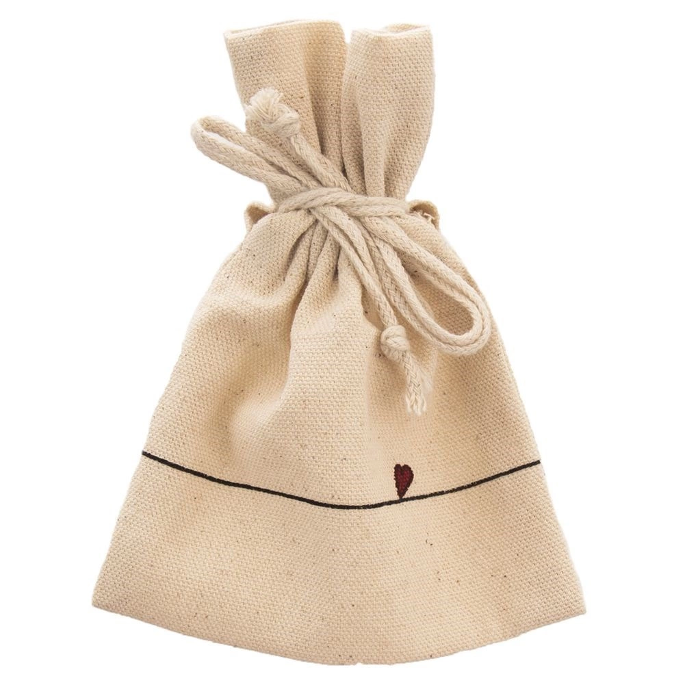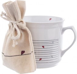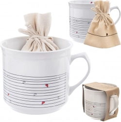 V paketu najdete tudi praktično bombažno vrečko v bež barvi s srčkom – idealna za sipan čaj, zelišča ali kot darilna embalaža. Skodelica je preprosta za vzdrževanje, primerna za pomivalni stroj in mikrovalovno pečico; vrečko lahko perete do 30 °C.