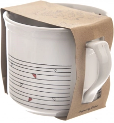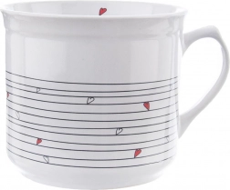 Kakovostna bela keramika z dekorjem srčkov, primerna za pomivalni stroj in mikrovalovno pečico. Ravna osnova omogoča tudi segrevanje napitkov na plošči.