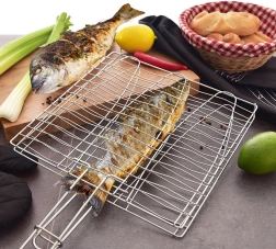 Praktična dvostranska mreža za peko rib z lesenim ročajem omogoča preprosto in varno obračanje brez razpadanja hrane. Vanjo gredo do tri ribe, koš je iz kakovostne kromirane kovine in ima drsno zaklepanje za zanesljiv oprijem. Univerzalna uporaba za ribe, meso in zelenjavo, dolg ročaj za udobno rokovanje ter enakomerna cirkulacija toplote za popoln rezultat.