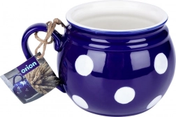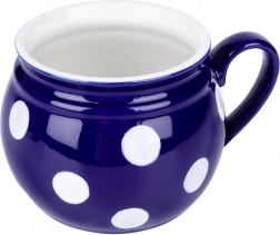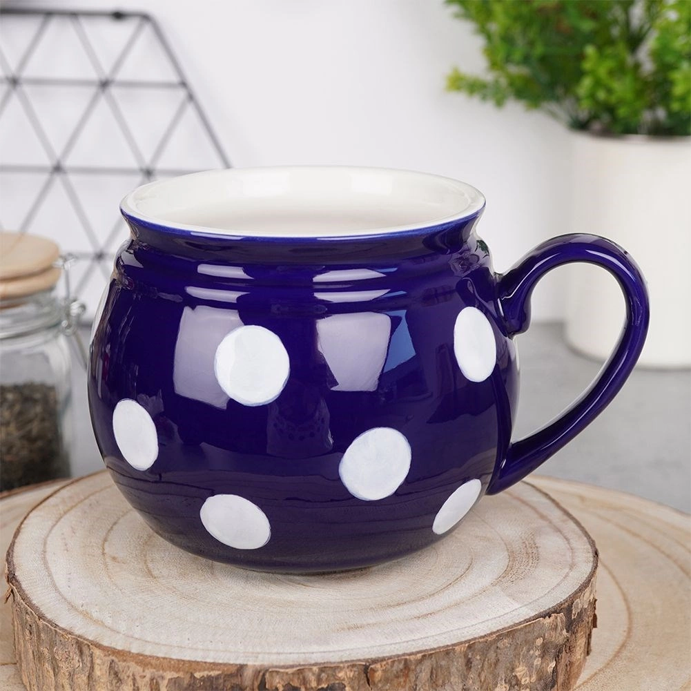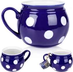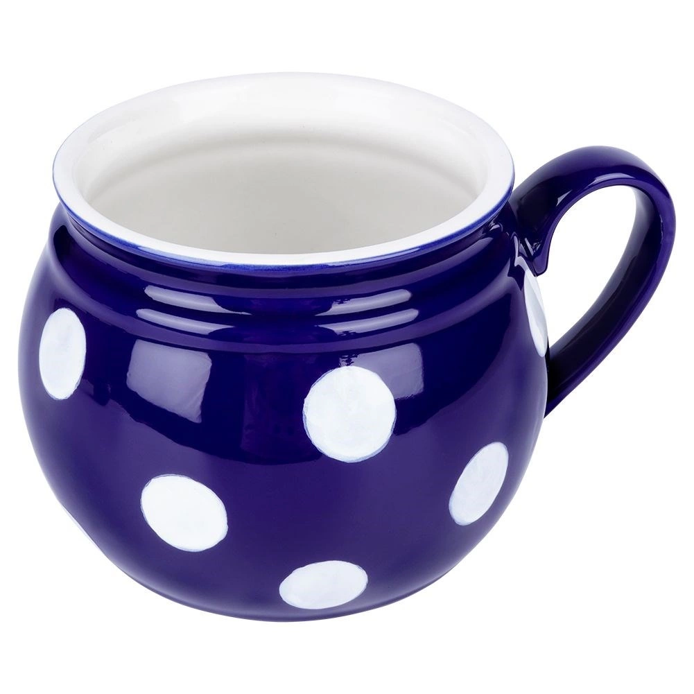 Uživajte v najljubših napitkih v velikem slogu. Ta keramična skodelica s prostornino 850 ml je odlična izbira za vse, ki imajo radi večje porcije čaja, kave ali zeliščnih napitkov. Klasična sodčasta oblika, temno modra glazura in velike bele pike dodajo pogrnjeni mizi pridih šika in se odlično ujemajo z drugim namiznim priborom.