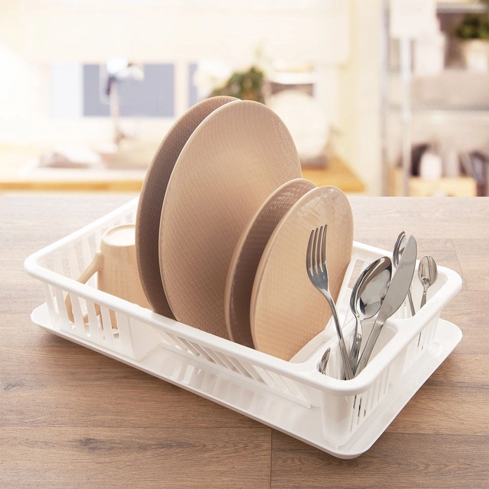 Ohranite red ob pomivalnem koritu in pospešite sušenje posode s kompaktnih odcejevalnikom, ki združuje funkcionalnost ter čist, univerzalen videz. Bela plastika je preprosta za vzdrževanje, odstranljiv pladenj pa zadržuje vodo in tako ščiti kuhinjski pult pred vlago in madeži.