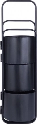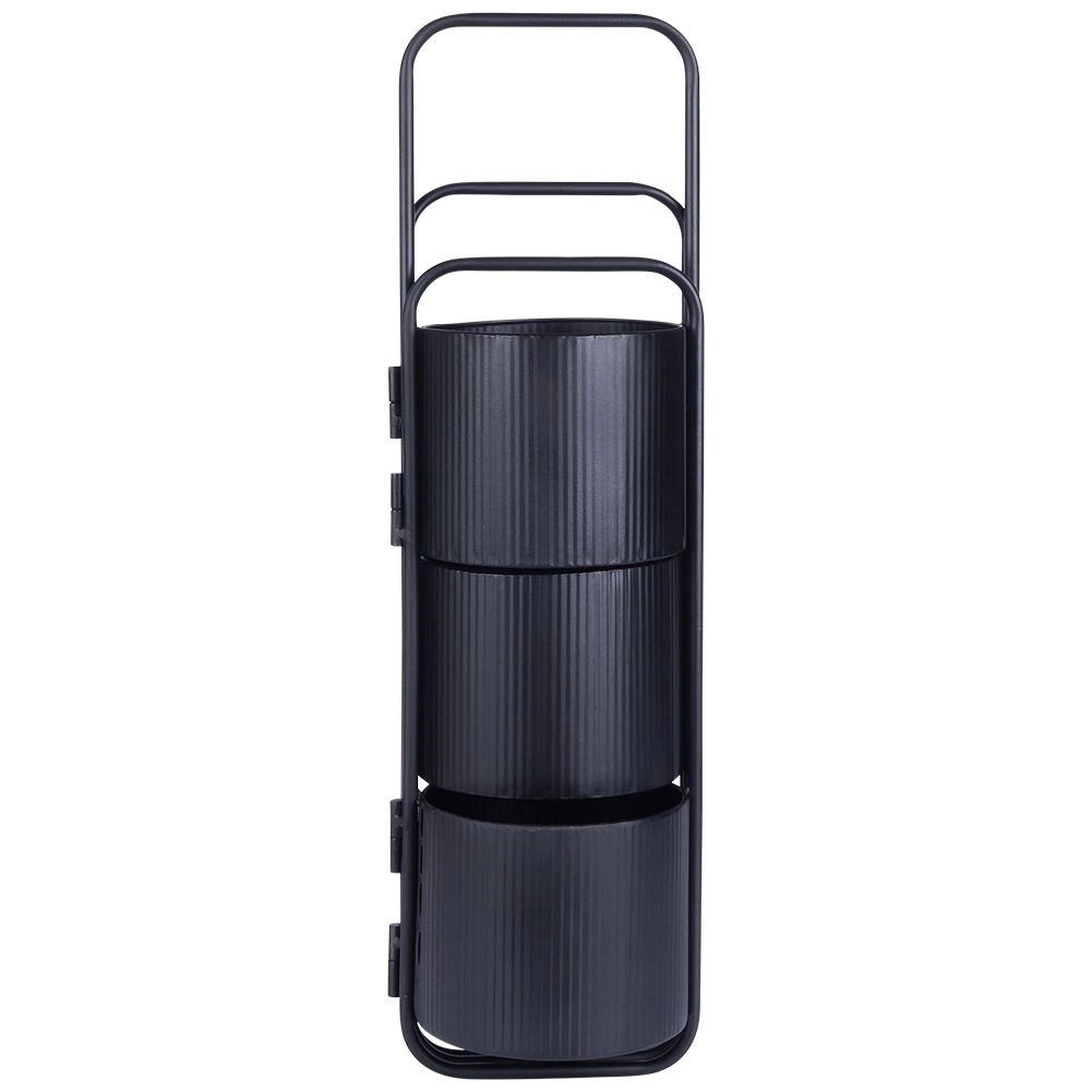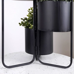 Mat črna površinska obdelava in rebrast dizajn posod dodajata moderen videz, medtem ko trdna, v celoti kovinska konstrukcija zagotavlja vzdržljivost in stabilnost. Vrtljivi in nastavljivi nosilci omogočajo prilagoditi razporeditev posameznih poličk glede na razmere v prostoru ali na balkonu.