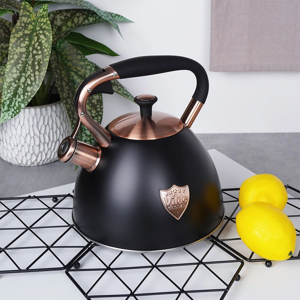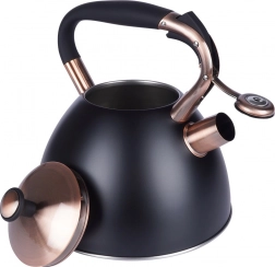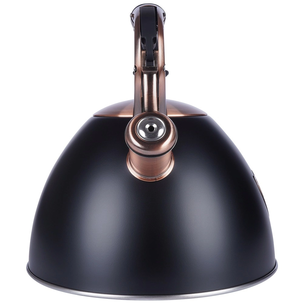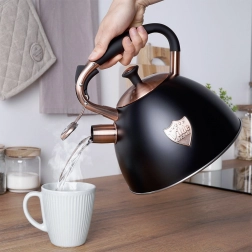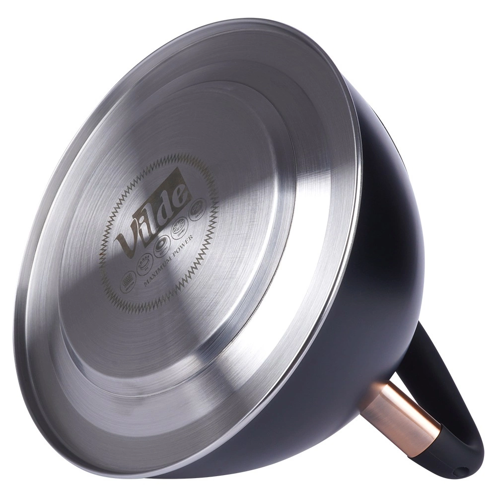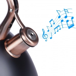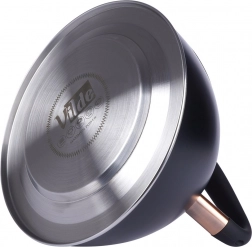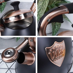 Ta dizajnerska čajnika iz nerjavnega jekla združuje mat črno površino z elegantnimi bakrenimi detajli. Zahvaljujoč uporabni prostornini 2,5 l (skupno 3 l) brez težav pripravite vodo za kavo, čaj in zelišča za vso družino. Akutermično dno zagotavlja hitro in enakomerno porazdelitev toplote tudi pri nizkem ognju, kar prihrani energijo in čas.