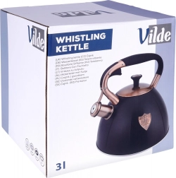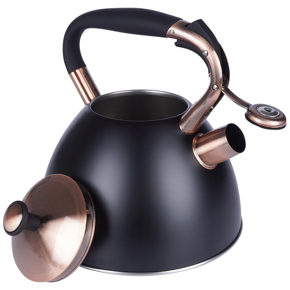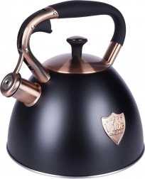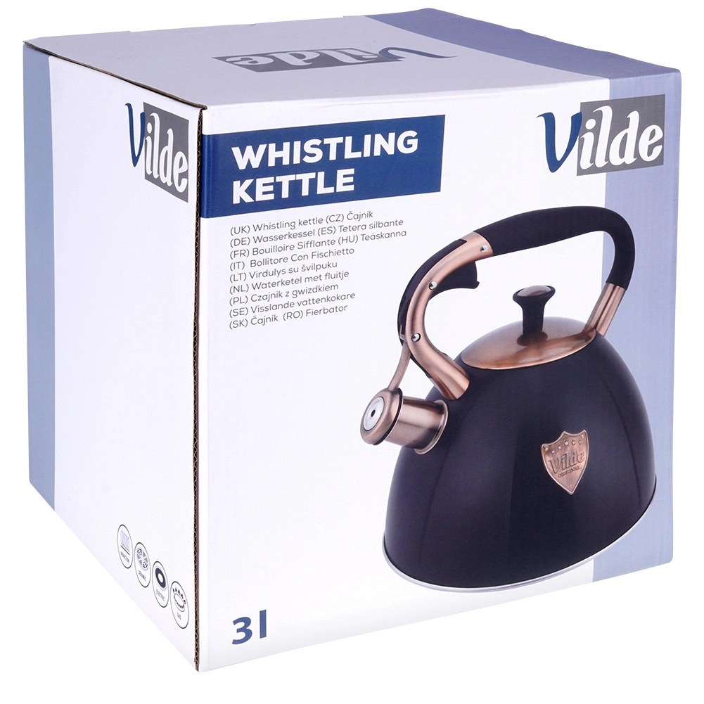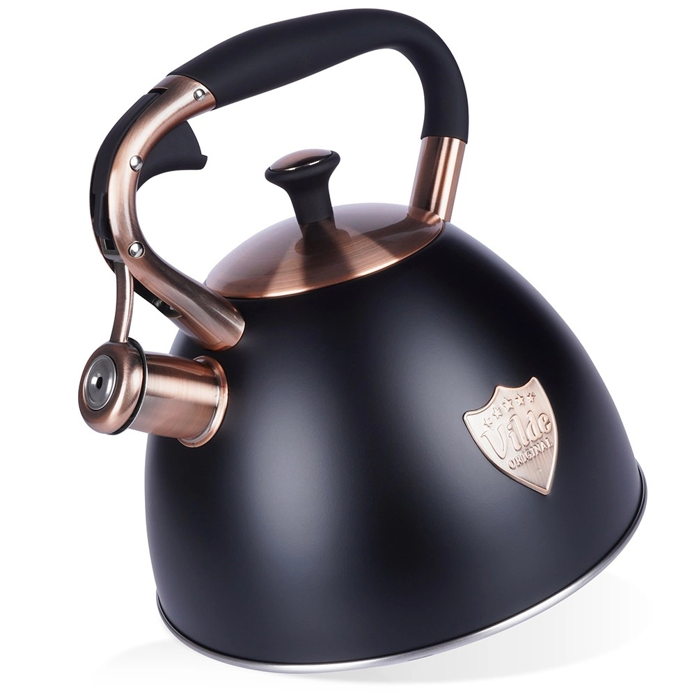 Ta dizajnerska čajnika iz nerjavnega jekla združuje mat črno površino z elegantnimi bakrenimi detajli. Zahvaljujoč uporabni prostornini 2,5 l (skupno 3 l) brez težav pripravite vodo za kavo, čaj in zelišča za vso družino. Akutermično dno zagotavlja hitro in enakomerno porazdelitev toplote tudi pri nizkem ognju, kar prihrani energijo in čas.