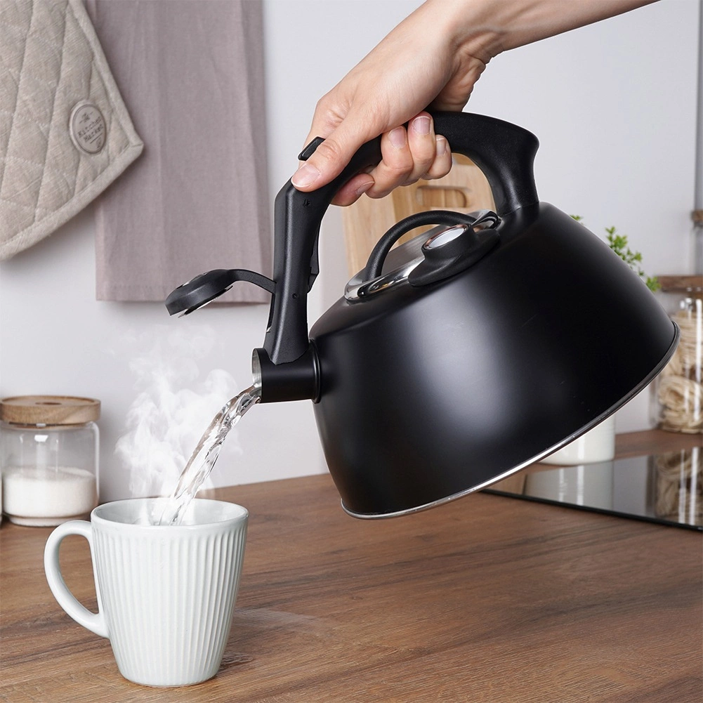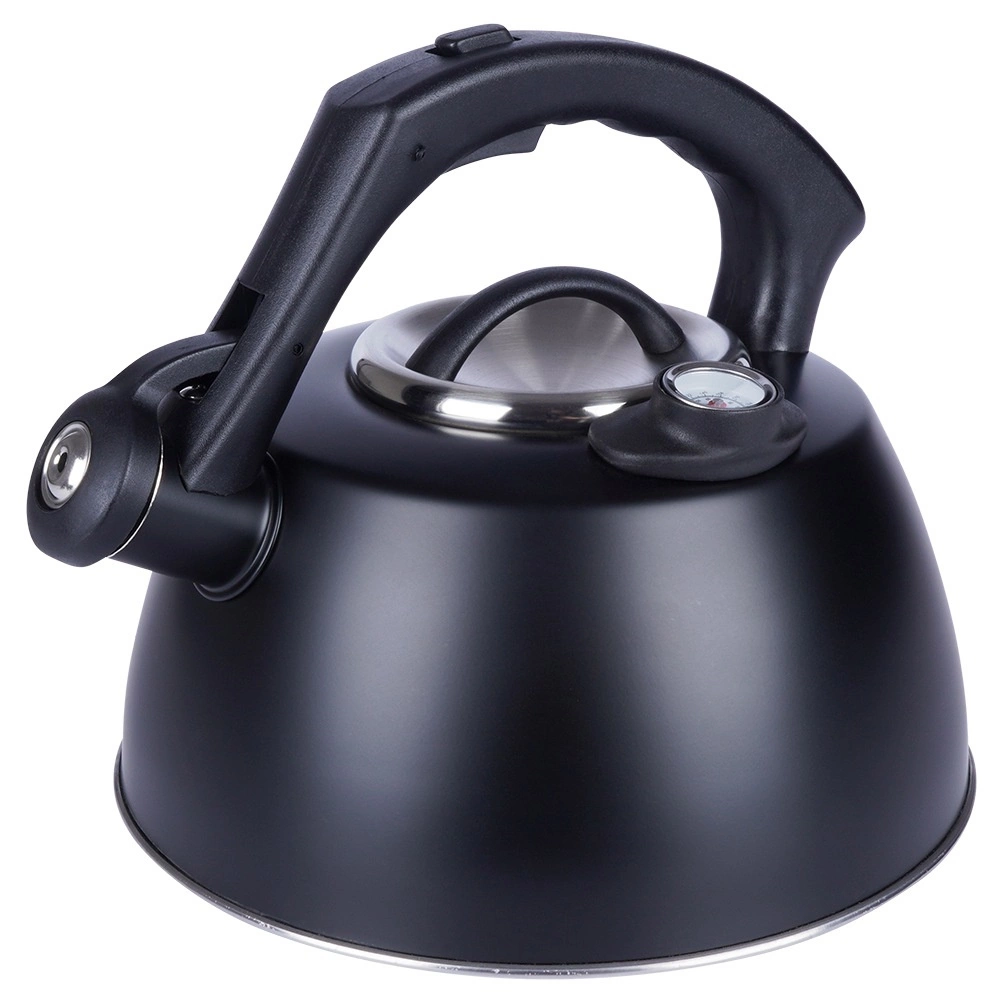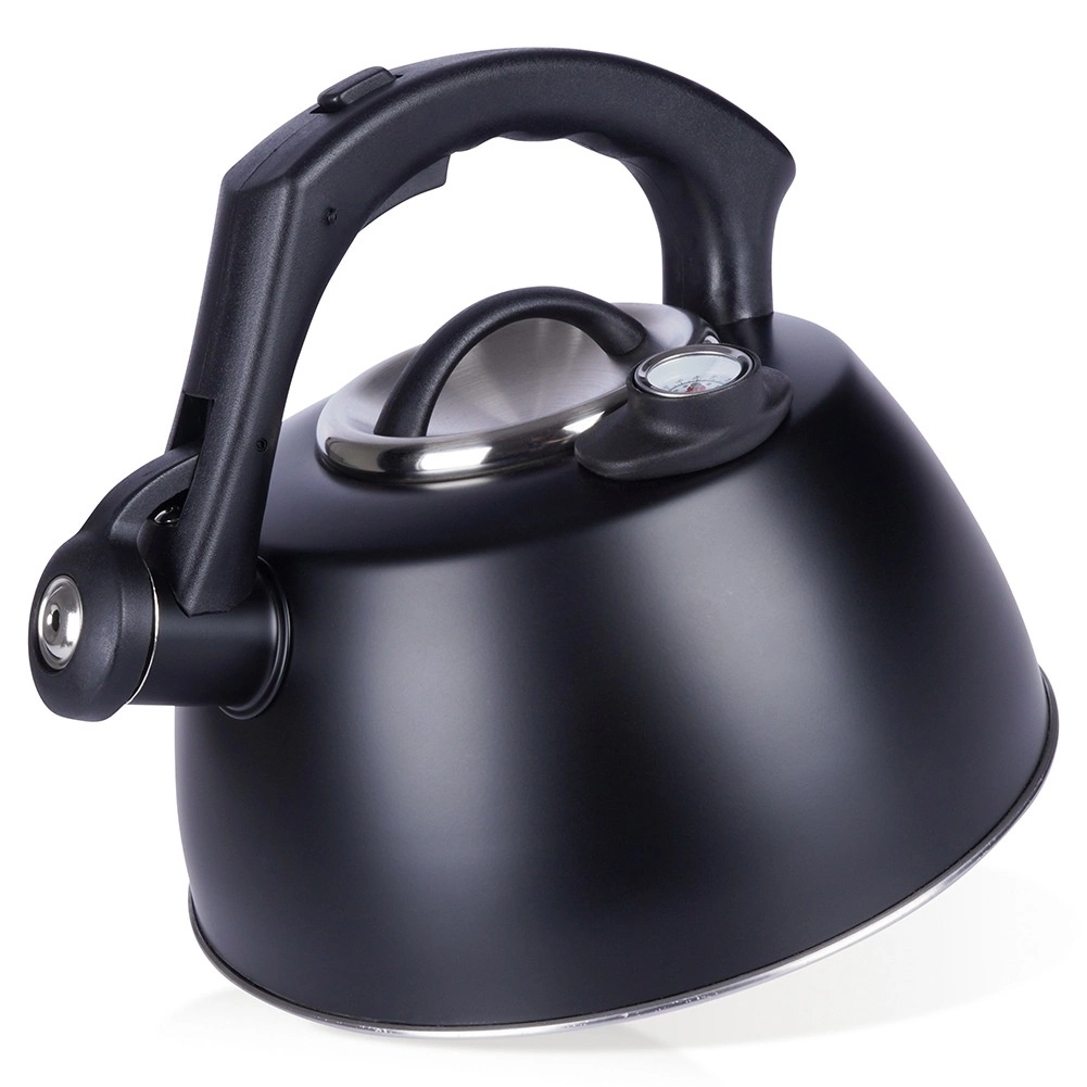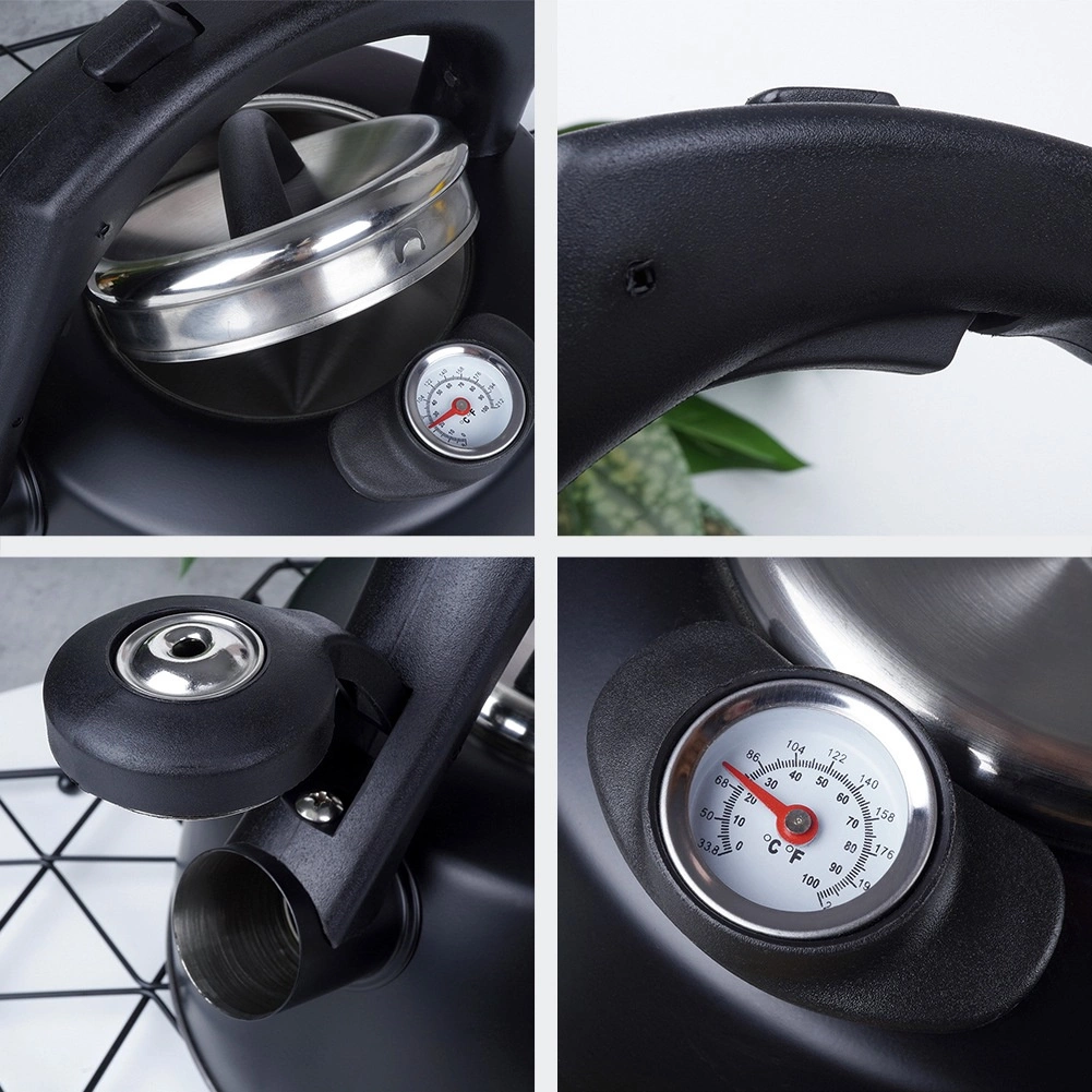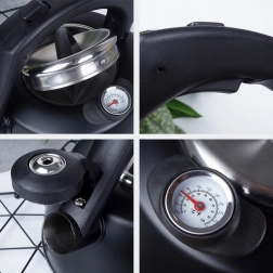 Elegantna čajnica s termometrom je izdelana iz trpežnega nerjavečega jekla z mat črnim zaključkom. Zahvaljujoč širokemu dnu in akutermičnemu sloju se voda segreva hitro in varčno, medtem ko berljiv termometer (0–100 °C / 33,8–212 °F) omogoča pripravo napitkov pri idealni temperaturi. Praktična piščalka se odpira z gumbom v ročaju za varno in udobno nalivanje.