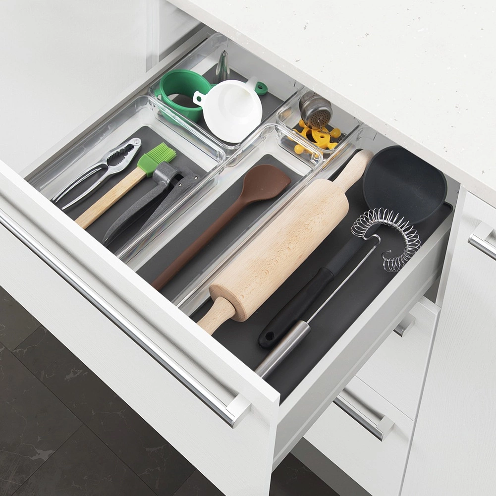 Uredite svoje predale in police hitro ter učinkovito. Prozorne stene omogočajo takojšen pregled nad vsebino, medtem ko siva TPR vložka preprečuje drsenje predmetov. Organizator je vzdržljiv, stabilen in se zaradi kompaktne širine odlično prilega tudi ozkim prostorom.