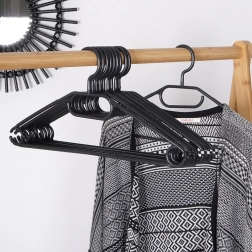 Ohranite garderobo pregledno s kompletom 10 kakovostnih obešalnikov v elegantni črni barvi. Zahvaljujoč vrtljivi kljukici jih zlahka namestite v katerokoli omaro, medtem ko več obešalnih točk omogoča obešanje srajc, suknjičev, kril, hlač in dodatkov, kot so šali ali kravate.
