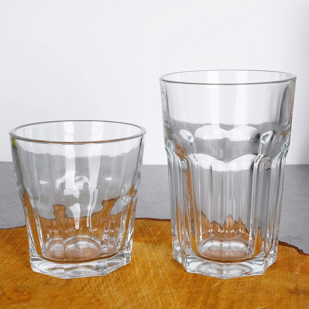 Prozorno, čvrsto steklo s fasetnim vzorcem zagotavlja stabilnost, vzdržljivost in privlačen videz pijač.