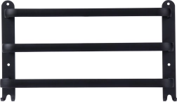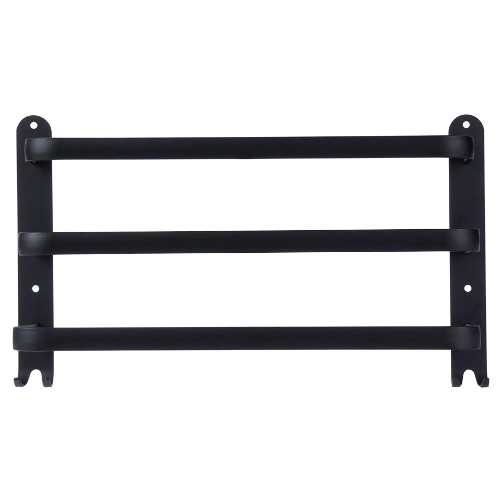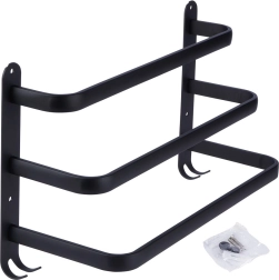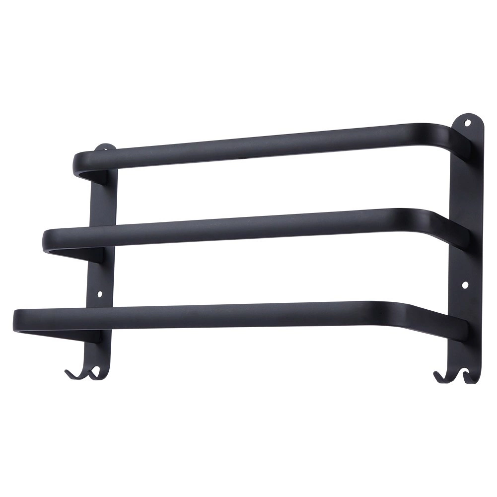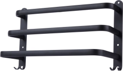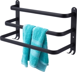 Stilsko in vzdržljivo držalo za brisače za pregledno organizacijo vaše kopalnice. Tri horizontalne palice omogočajo učinkovito sušenje in prezračevanje brisač, medtem ko štiri kljukice v spodnjem delu nudijo prostor za gobice ali dodatke. Minimalističen dizajn v mat črni barvi poudari značaj interierjev v skandinavskem, modernem in loft slogu.