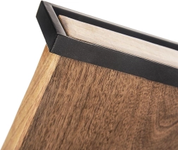 Pladenj iz mangovega lesa v pravokotni obliki izstopa po naravni lepoti materiala in dolgi življenjski dobi. Zahvaljujoč povišanim robovom in robustnim kovinskim ročajem boste varno prenesli kavo, čaj, deserte in manjše jedi. Površina je enostavna za vzdrževanje, les je odporen na vlago in deformacije ter ne vpija vonjav.