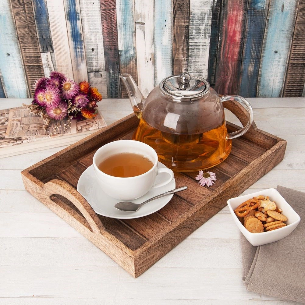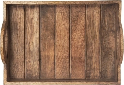 Pravokotni servirni pladenj iz mangovega lesa izstopa po trdnosti, odpornosti na vlago in naravni lesni strukturi. Zahvaljujoč vgrajenim ročajem lahko udobno prenašate kavo, čaj, sladice in celoten zajtrk. Protizdrsne podloge na spodnji strani ščitijo mizo in zagotavljajo stabilnost.