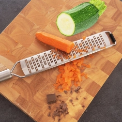 Univerzalno ravno strgalo je odličen pomočnik za vsakodnevno kuhanje in peko. Ostra, jedkana rezila delujejo v obe smeri, zato ribate hitreje in z manj napora. Idealno za korenje, krompir, bučke, rdečo peso, citusovo lupinico, čokolado in parmezan.