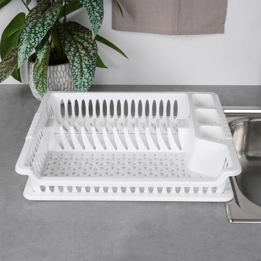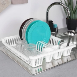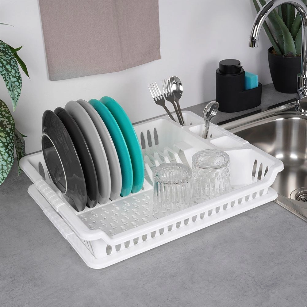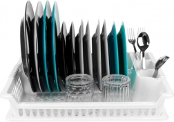 Ohranite red po ročnem pranju posode s tem prostornim odcejalnikom, ki nudi prostor za do 12 krožnikov, kozarce in pribor. Vgrajeni predelki in odstranljiv odcejalni pladenj zagotavljajo učinkovit odtok vode in suh delovni pult. Minimalističen dizajn v beli barvi se poda tako modernim kot klasičnim kuhinjam.