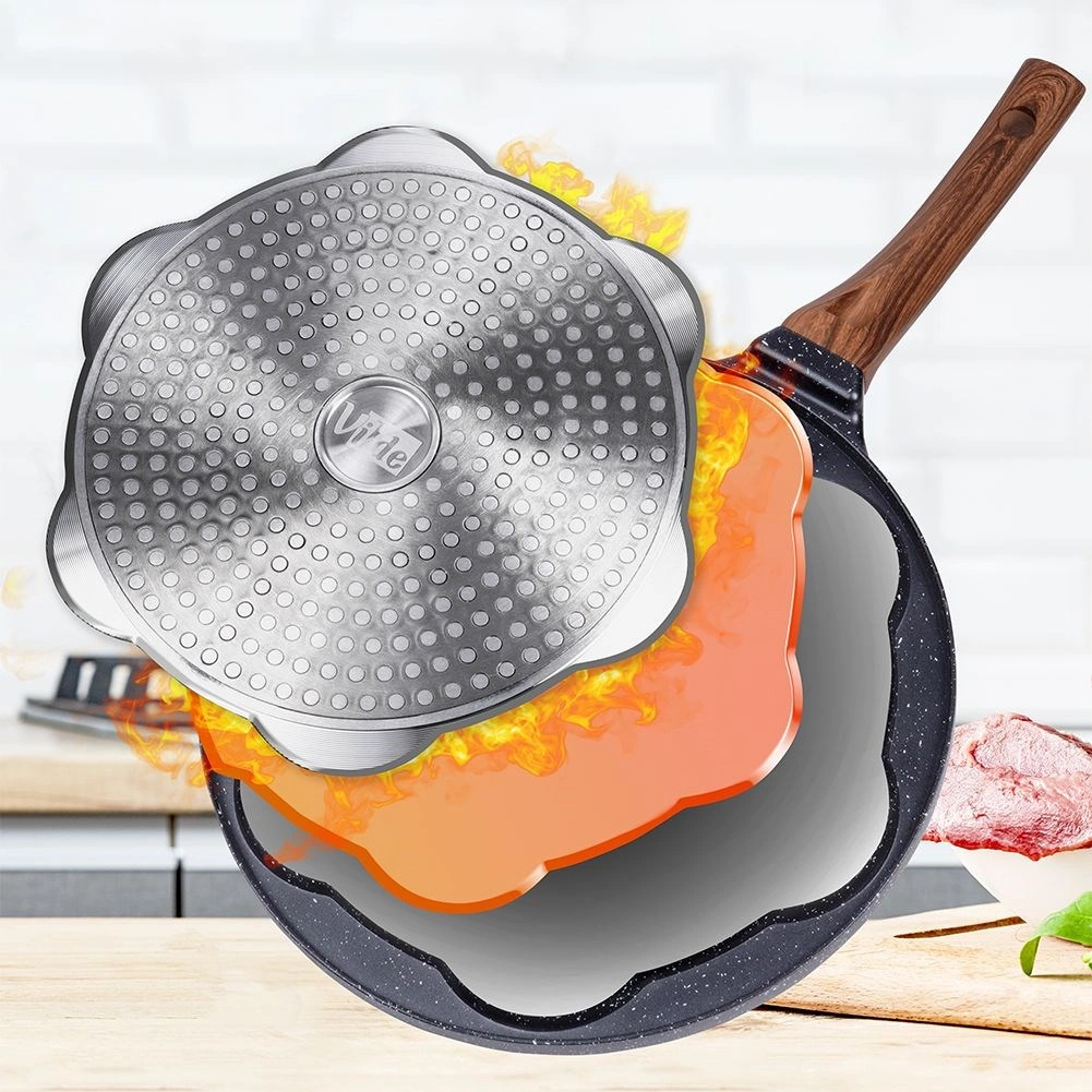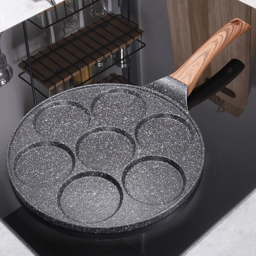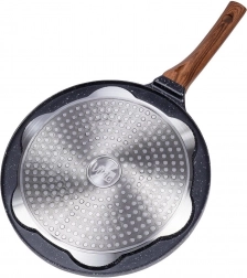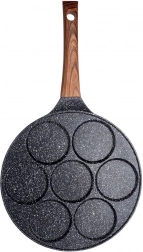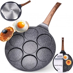 Pripravite popolno okrogla jajca na oko, palačinke ali mini palačinke – ta ponev s 7 vdolbinami vam olajša vsak zajtrkovni meni. Granitni nelepljivi premaz v črno-sivem videzu “stone” preprečuje prijemanje in omogoča bolj zdravo pripravo z minimalno količino olja. Slogovna kombinacija BLACK&WOOD se odlično poda v moderno kuhinjo.
