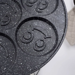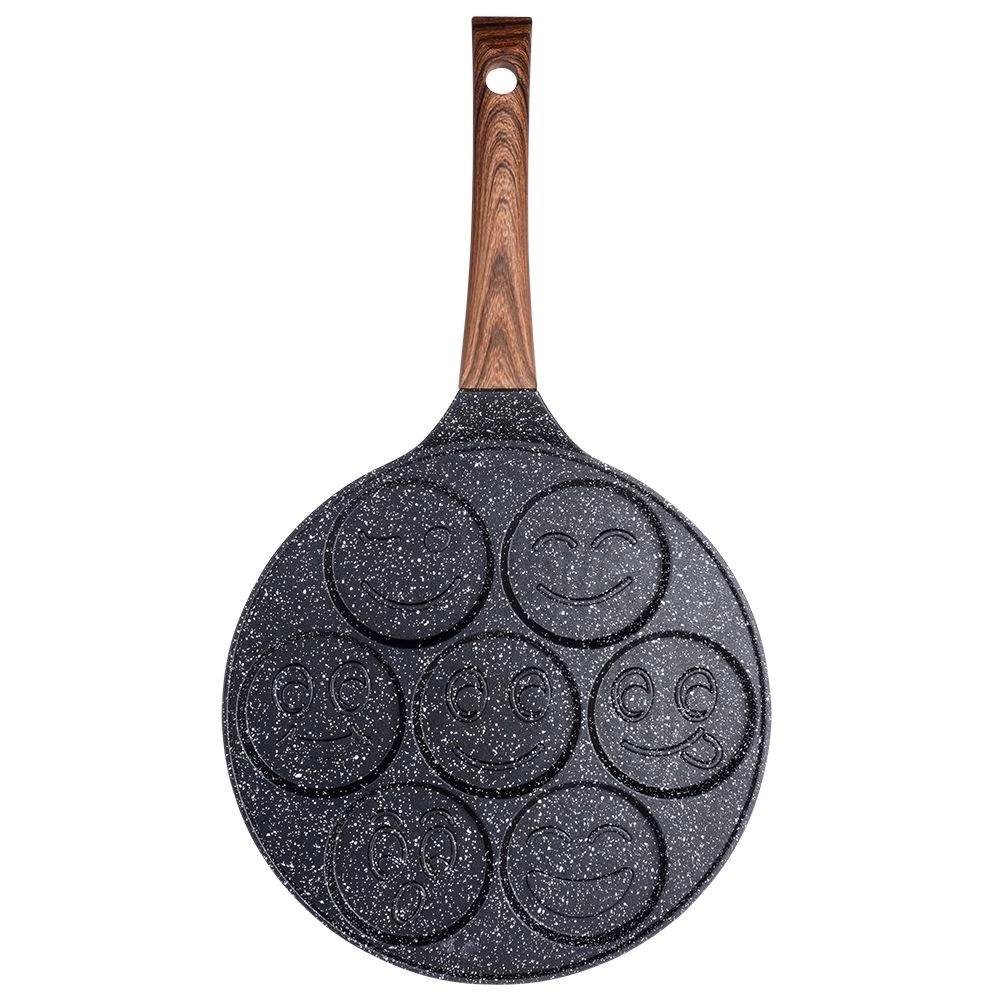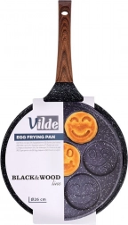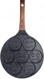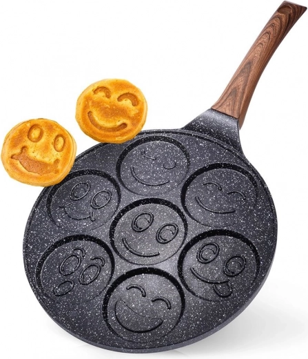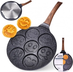 Odkrijte veselje do kuhanja s ponevjo za jajca in palačinke, ki združuje moderen videz BLACK & WOOD z maksimalno funkcionalnostjo. Sedem globljih vdolbin z reliefnimi nasmejanimi obrazi oblikuje popolnoma okroglje porcije in doda zajtrkom igriv videz. Granitna neprijemljiva plast omogoča cvrtje z minimalno količino olja in olajša čiščenje.