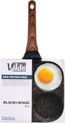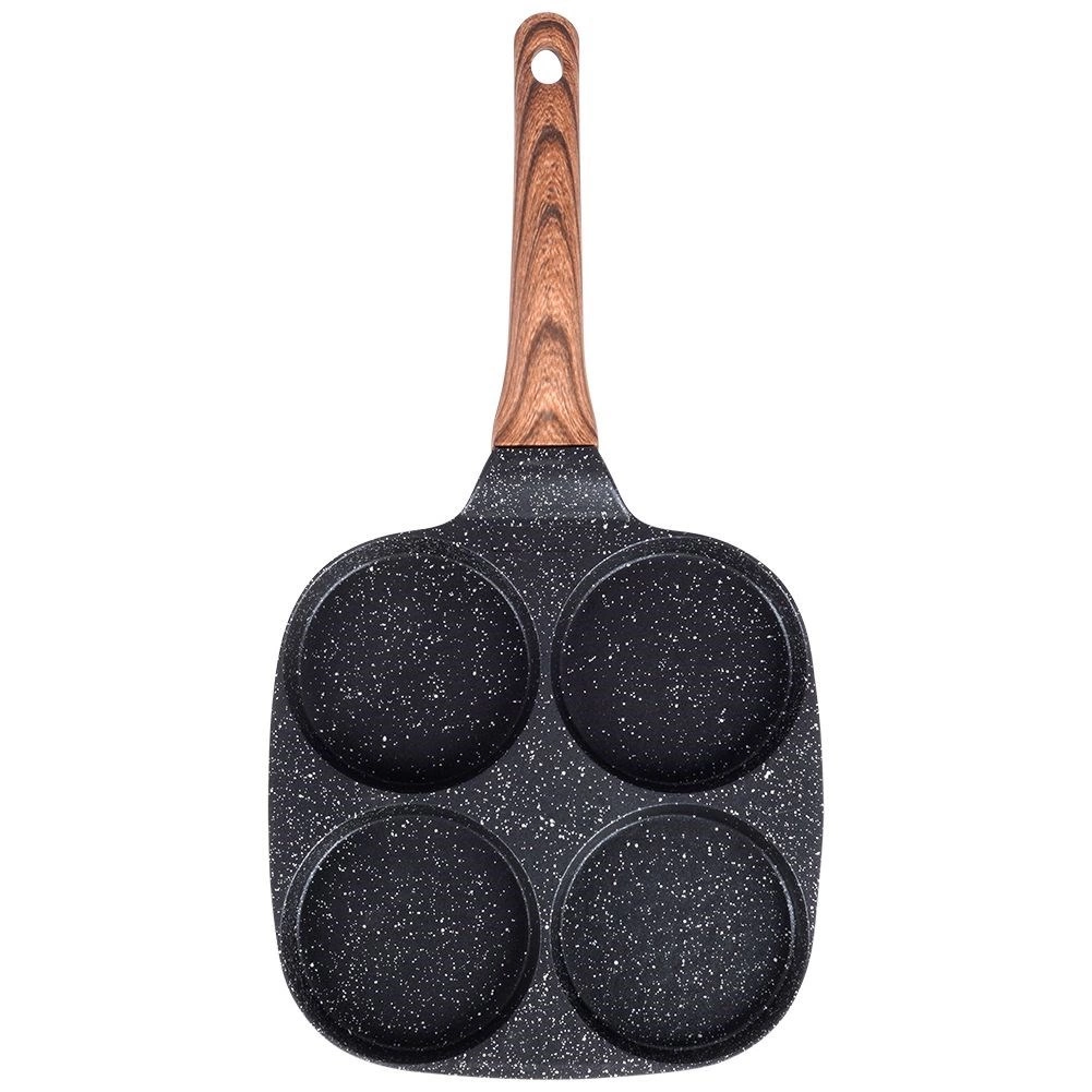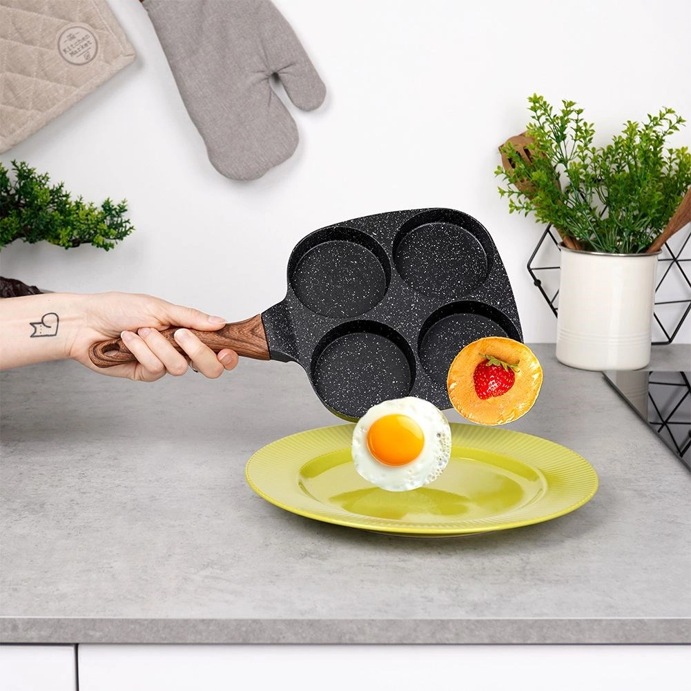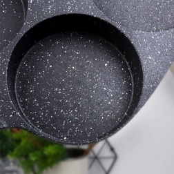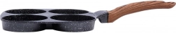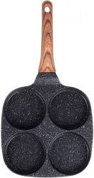 Praktična ponev s štirimi okroglimi oblikami premera 8,5 cm za popolno oblikovana jajca, flancate in mini palačinke. Odporno aluminijasto telo z nelepljivo granitno površino v črni barvi omogoča kuhanje z minimalno količino maščobe, enakomerno prevaja toploto ter prihrani čas in energijo. Ergonomski ročaj z lesenim dekorjem je udoben, protidrsen in ima odprtino za obešanje. Ponev je primerna za plin, elektriko, steklokeramiko, halogen in indukcijo ter je enostavna za čiščenje, tudi v pomivalnem stroju.