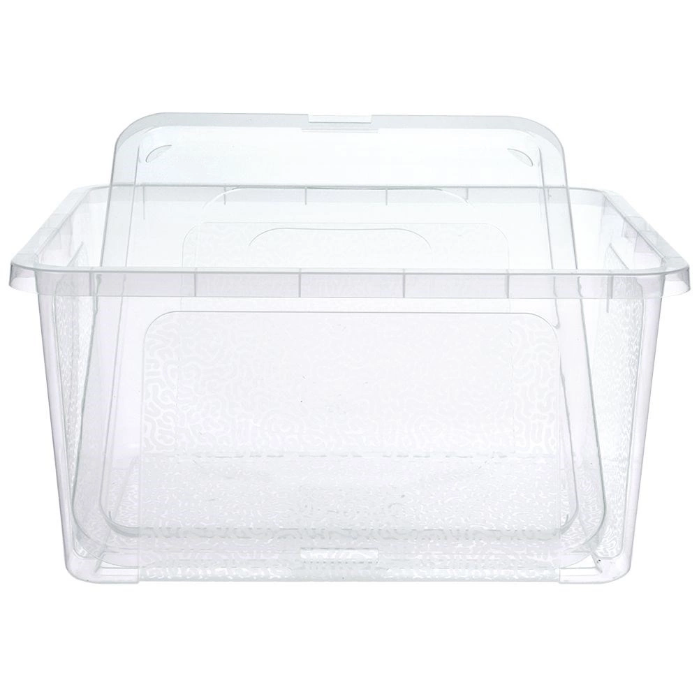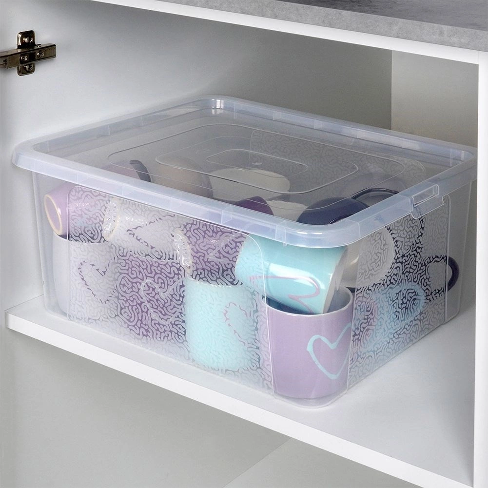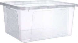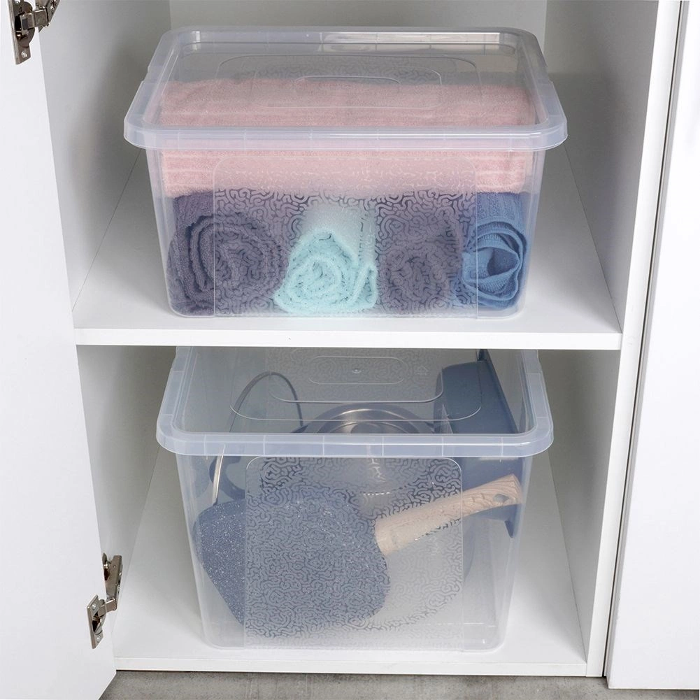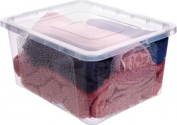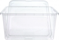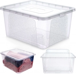Univerzalna škatla za shranjevanje s pokrovom pomaga pregledno organizirati tekstil, igrače, knjige, orodje in sezonsko opremo. Prozorna izvedba omogoča hiter pregled vsebine brez odpiranja, pokrov z nežnim »klikom« varno zapre in zaščiti vse v notranjosti. Zaobljeni robovi povečajo varnost pri rokovanju, robovi za zlaganje pa prihranijo prostor na policah in v garderobnih omarah.