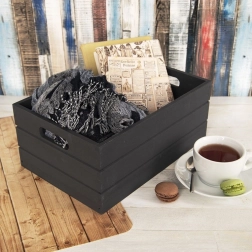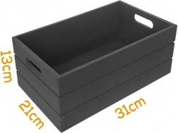Univerzalna lesena škatla v elegantni črni izvedbi pomaga ohranjati red v vsakem prostoru. Zahvaljujoč čvrstemu lesu in dvema stranskima odprtinama se enostavno prenaša in prenese vsakodnevno uporabo. Primerna je za polico, komodo ali pisalno mizo.