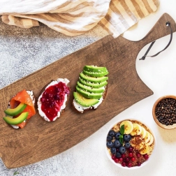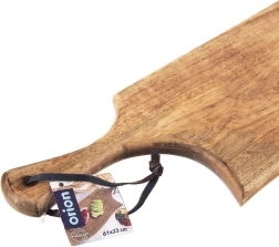 Praktičen ročaj olajša prenašanje, odprtina z usnjenim paščkom pa omogoča preprosto obešanje in sušenje. Deska meri 61 × 22 × 2 cm, zato nudi veliko delovno površino in hkrati lepo izstopa pri serviranje.