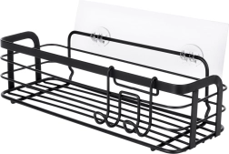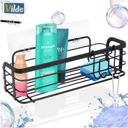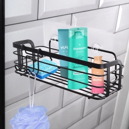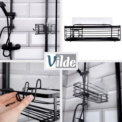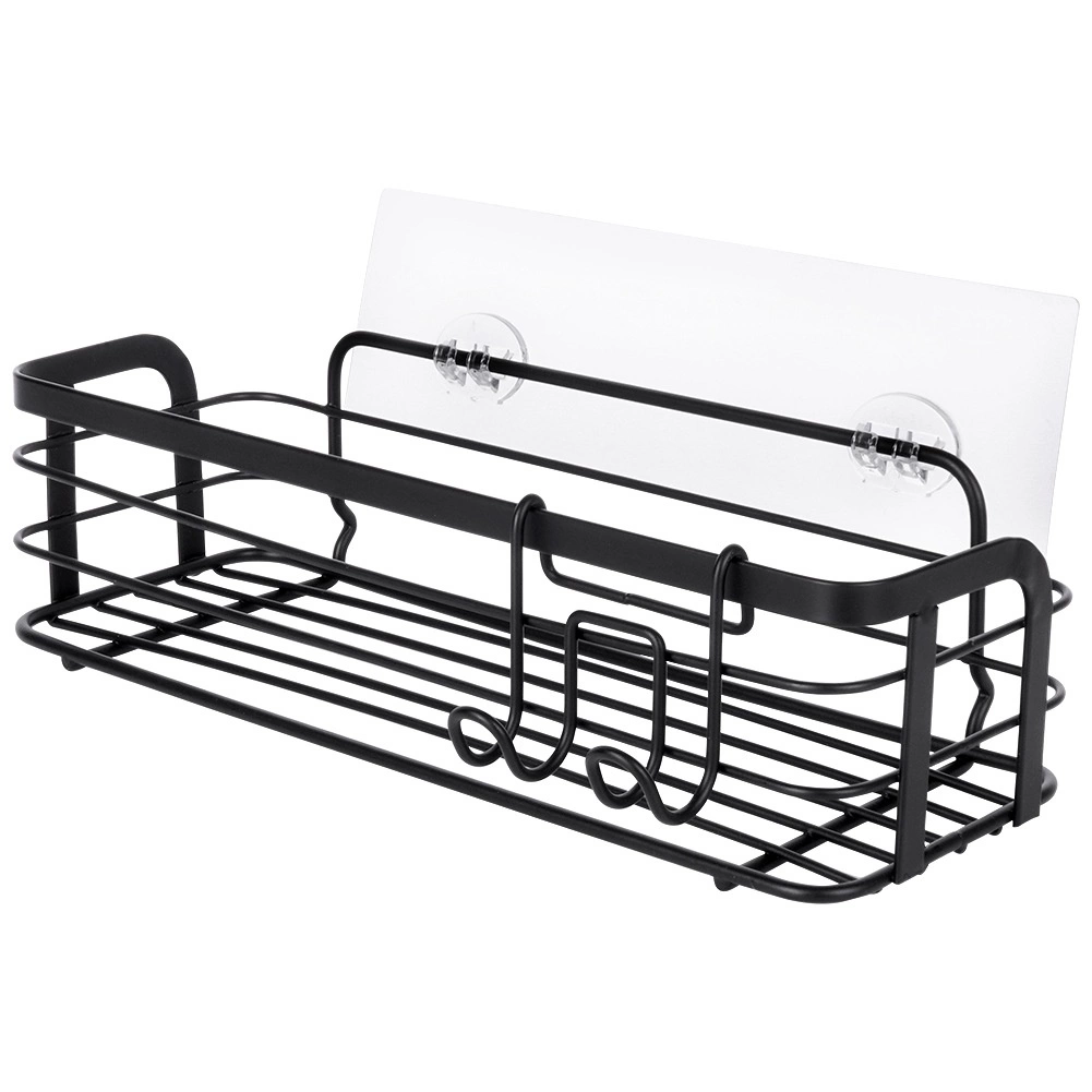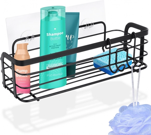 Praktična samolepilna polica za prho iz odporne kovine v mat črni barvi. Ponuja dovolj prostora za šampone, gele in kozmetiko, ima preprosto namestitev brez vrtanja in vključuje odstranljiv obešalnik z dvema kljukicama za dodatke. Nerjaveča obdelava, enostavno čiščenje in univerzalna uporaba v kopalnici in kuhinji.