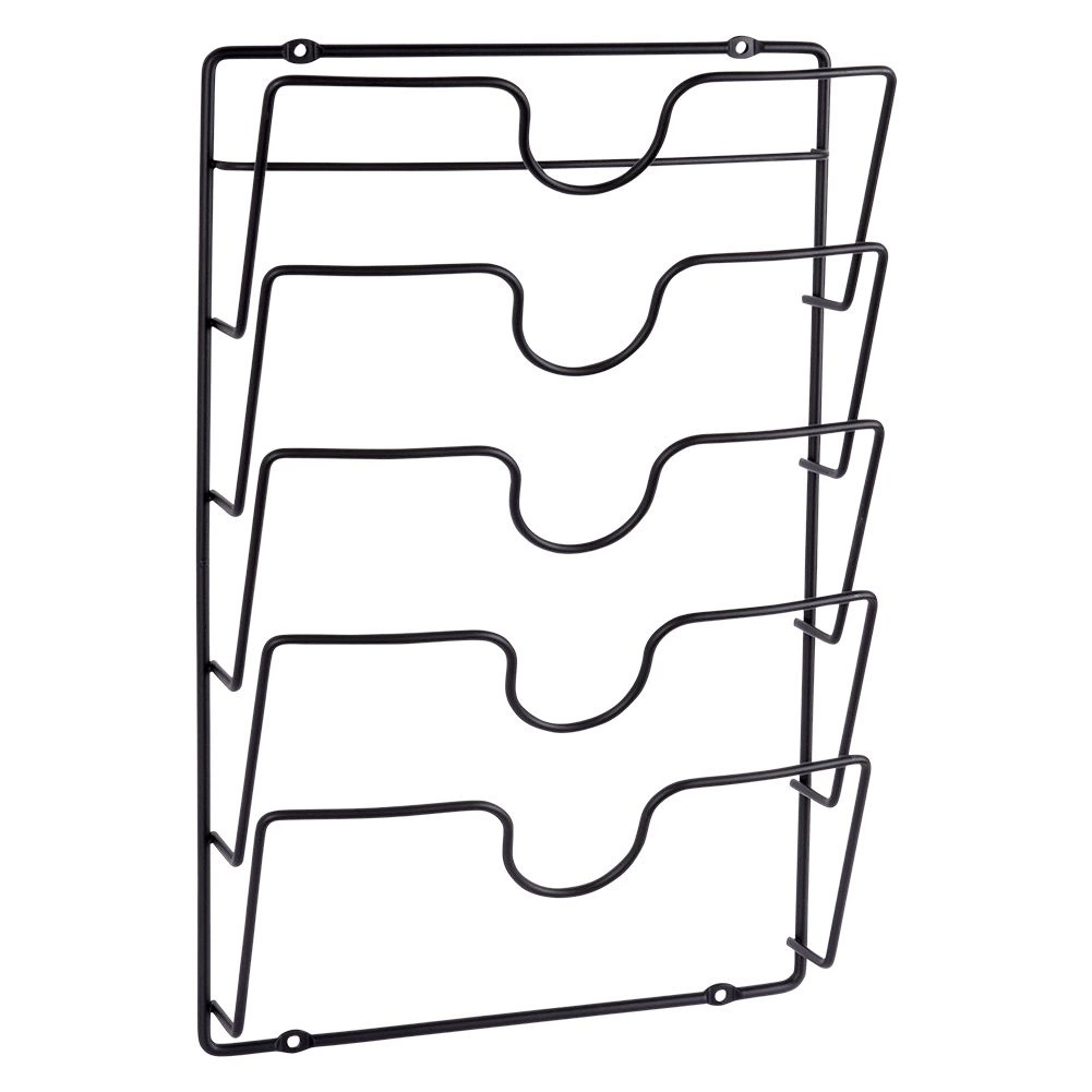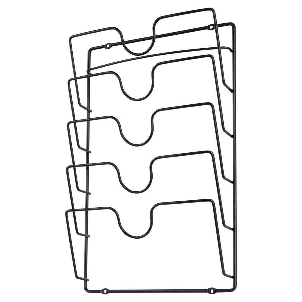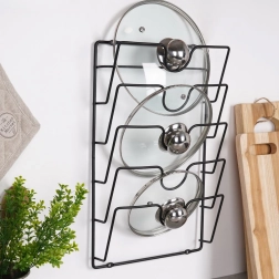 Praktični kovinski nosilec za pokrovke s kapaciteto do 5 pokrovov ohranja vašo kuhinjo popolnoma pregledno. Preprosto ga pritrdite na steno ali v notranjost omarice in tako prihranite prostor na delovni površini. Trpežna kovinska konstrukcija s prašnim lakiranjem v mat črni barvi zagotavlja dolgo življenjsko dobo in sodoben videz.