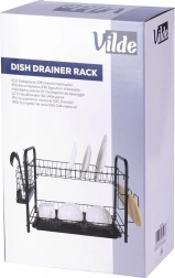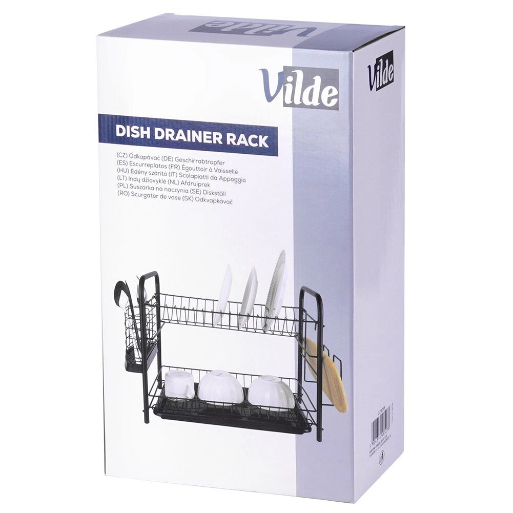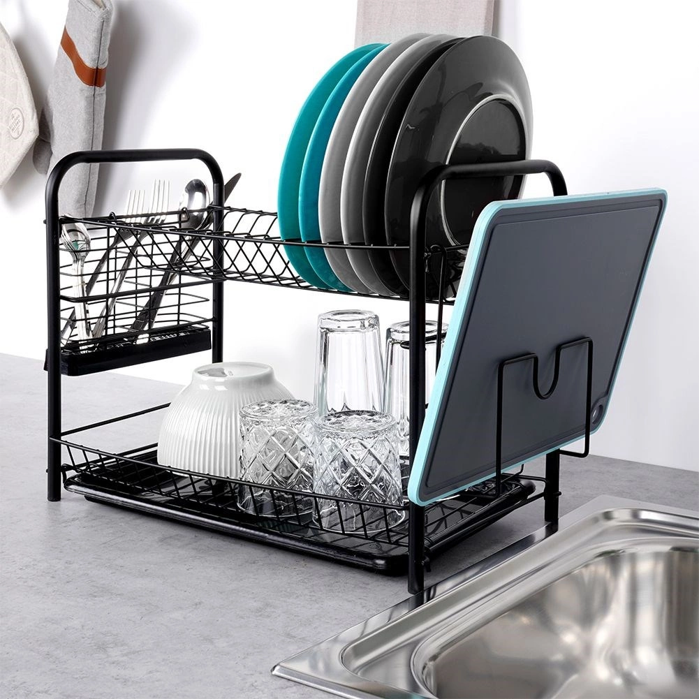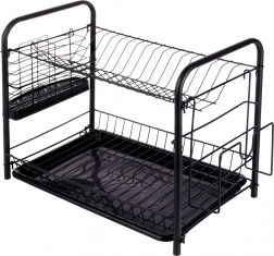 Stabilen okvir iz odporne kovine v mat črni barvi kuhinji doda moderen industrijski videz, hkrati pa prihrani prostor zahvaljujoč vertikalni zasnovi. Praktični dodatki, kot so dvoprekatna košarica za pribor, zunanje držalo za rezalno desko in stranski ročaji za enostavno prenašanje, bodo prišli prav vsak dan.