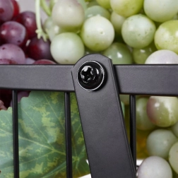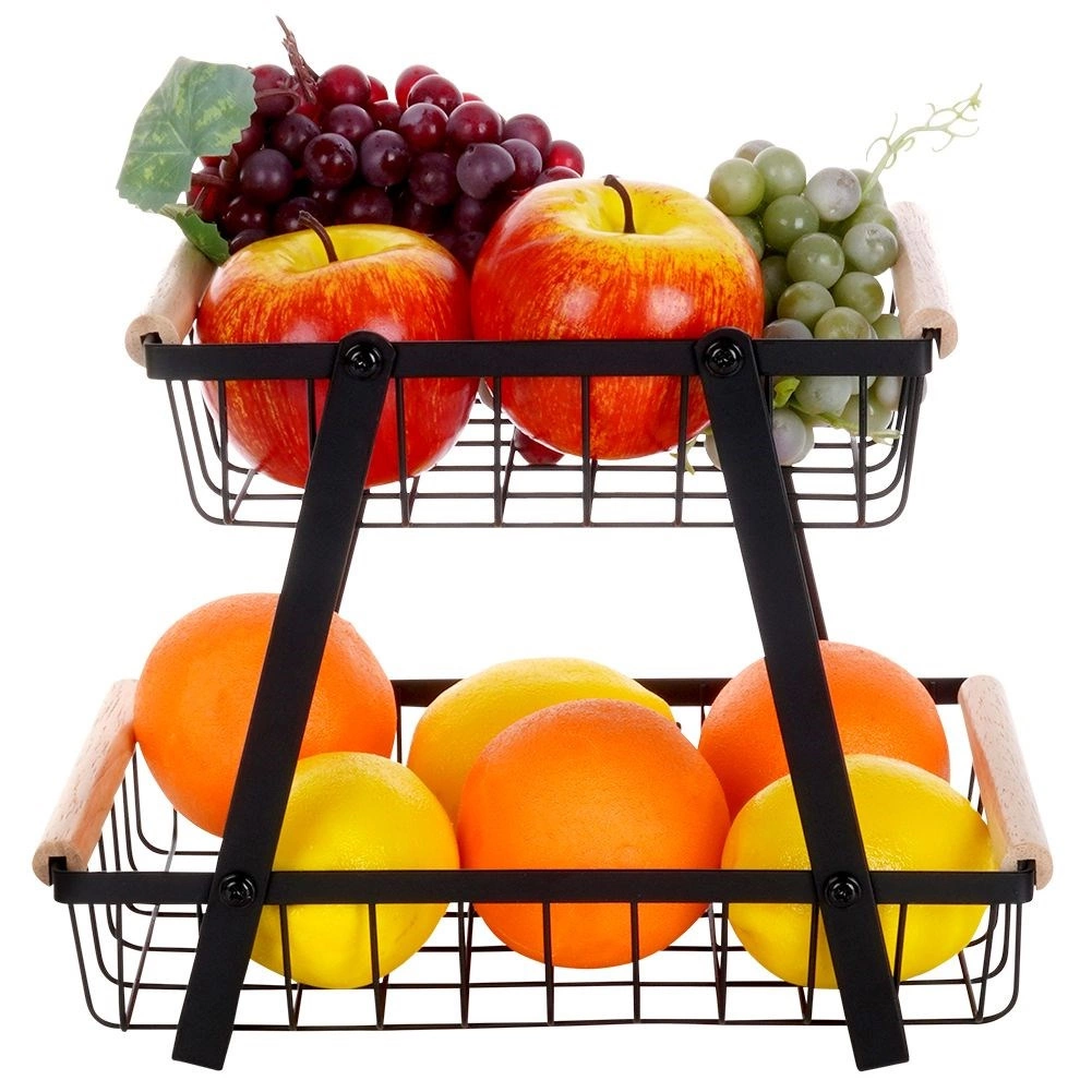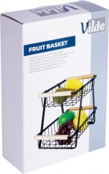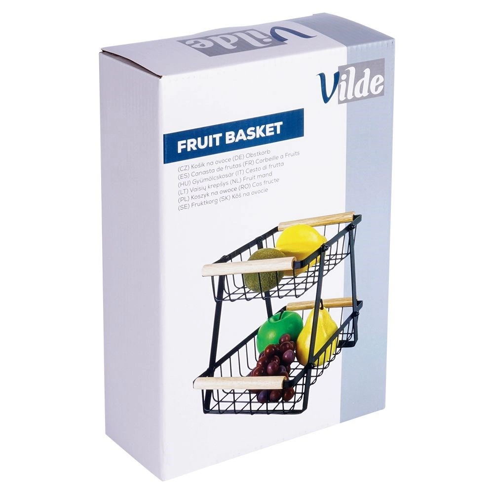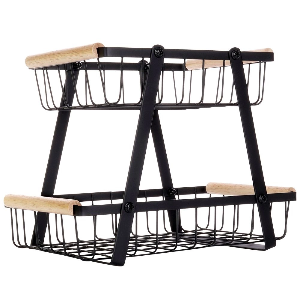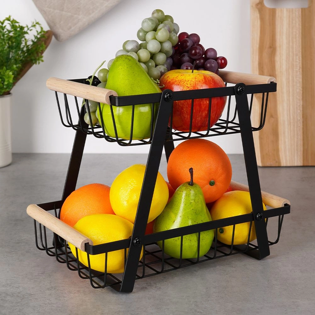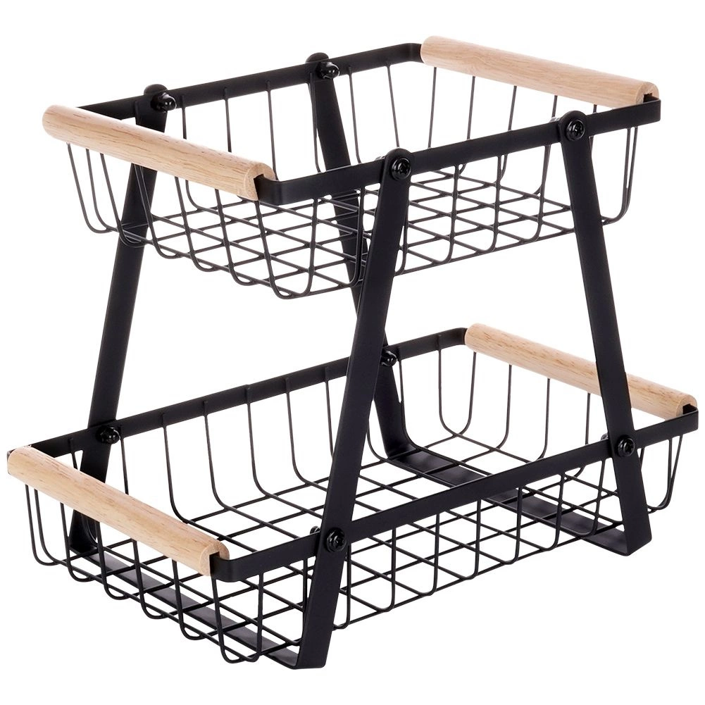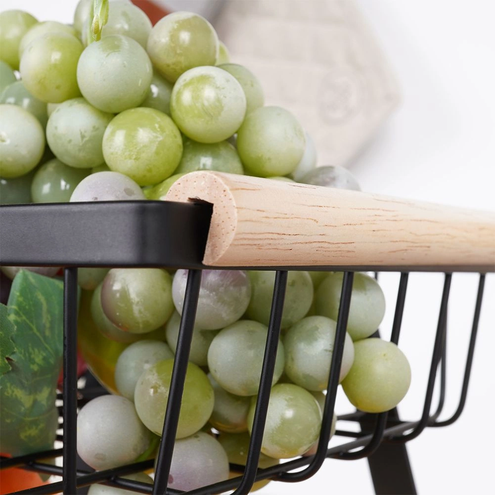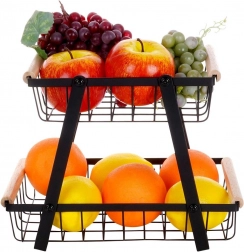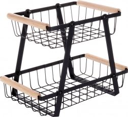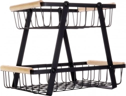 Ta dvostopenjski kovinski organizator združuje sodoben industrijski videz z visoko funkcionalnostjo. Odprte žičnate stranice zagotavljajo optimalno kroženje zraka, zaradi česar sadje in zelenjava dlje ostaneta sveža. Lesena ročaja omogočata udobno prenašanje, celoten stojalo pa je zaradi trdne konstrukcije vzdržljivo in stabilno.