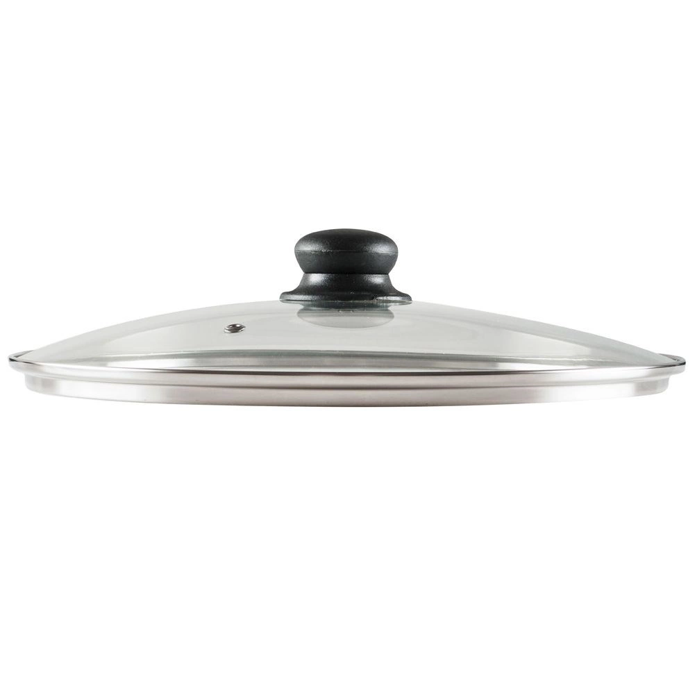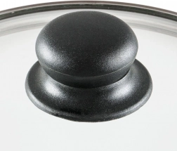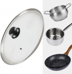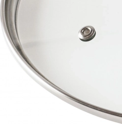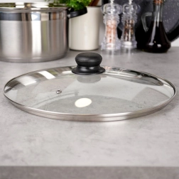 Pokrov je izdelan iz toplotno odpornega stekla z nerjavečim robom v elegantni srebrni barvi in vzdržljivim plastičnim ročajem v črni barvi. Je rahlo izbočen za boljšo cirkulacijo vročega zraka in opremljen z prezračevalno odprtino za varen odvod odvečne pare. Visok rob zagotavlja čvrsto in tesno prileganje na rob posode.