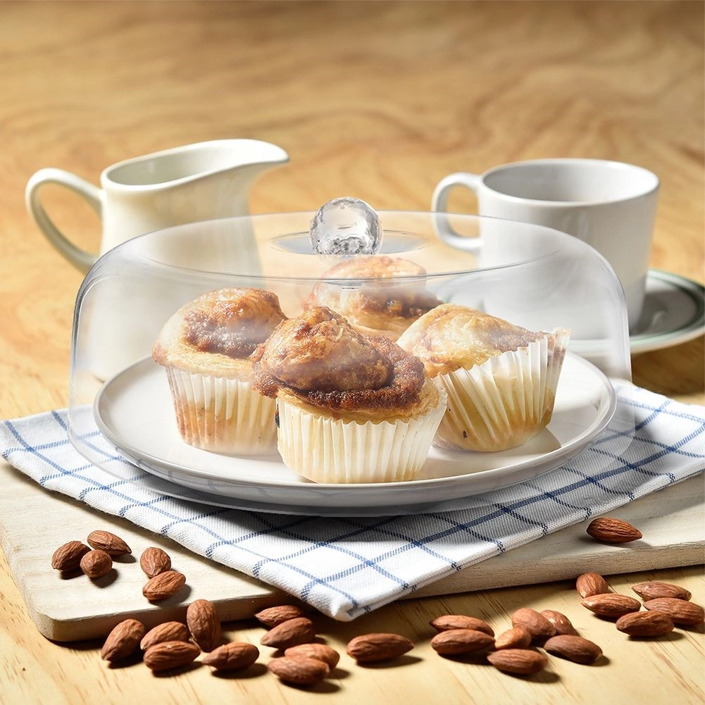 Prozoren akril ščiti hrano pred žuželkami in prahom, hkrati pa ohrani njen privlačen videz – idealno za torte, mafine in sendviče.
