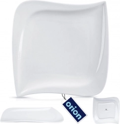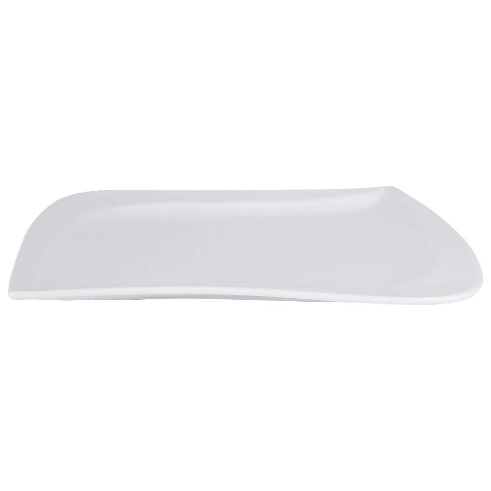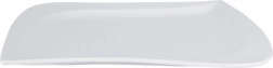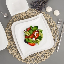 Beli porcelan z nežno ukrivljenimi robovi in obliko nepravilnega kvadrata povzdigne videz vsake pogrnjene mize.